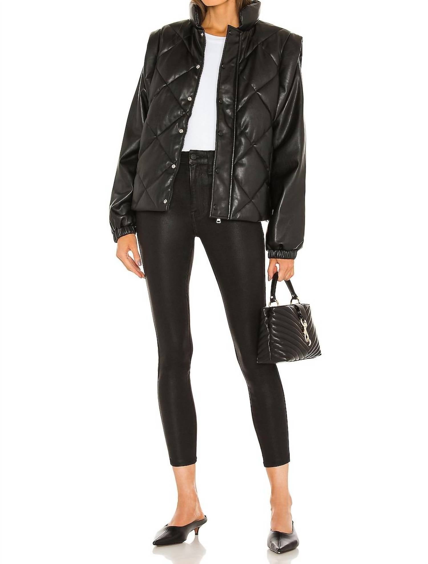 Temperaturas mais amenas significam jaquetas puffer fofas e esta é uma das favoritas dos fãs. Apresentando a Jaqueta e Colete Puffer de Manga Longa Callista da PISTOLA, uma adição chique e adaptável a qualquer guarda-roupa de inverno em elegante Noir. Esta peça versátil possui mangas compridas e uma composição com exterior em couro vegano acolchoado e flexível com costura diamante. Fabricado na China, oferece um design conversível com mangas removíveis, permitindo que se transforme facilmente de uma jaqueta em um colete. O Callista possui bolsos laterais, punhos elásticos, fecho de zíper frontal com sobreposição de botão de pressão e é forrado para maior aquecimento. Composição: Revestimento 100% Poliuretano, Base 100% Algodão, Forro e Enchimento 100% Poliéster. Cuidados: Lavar somente à mão.