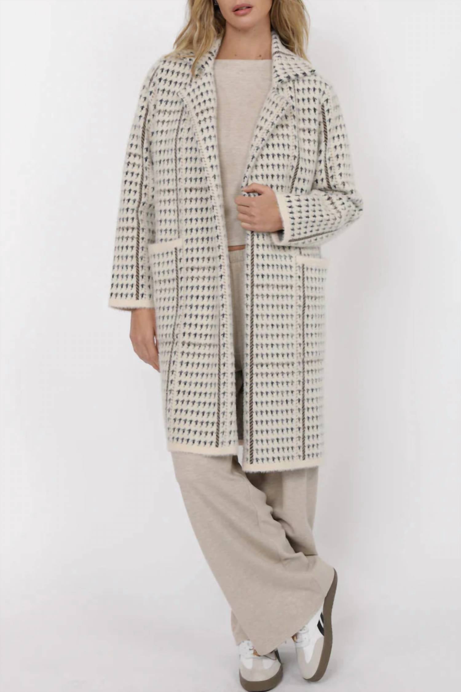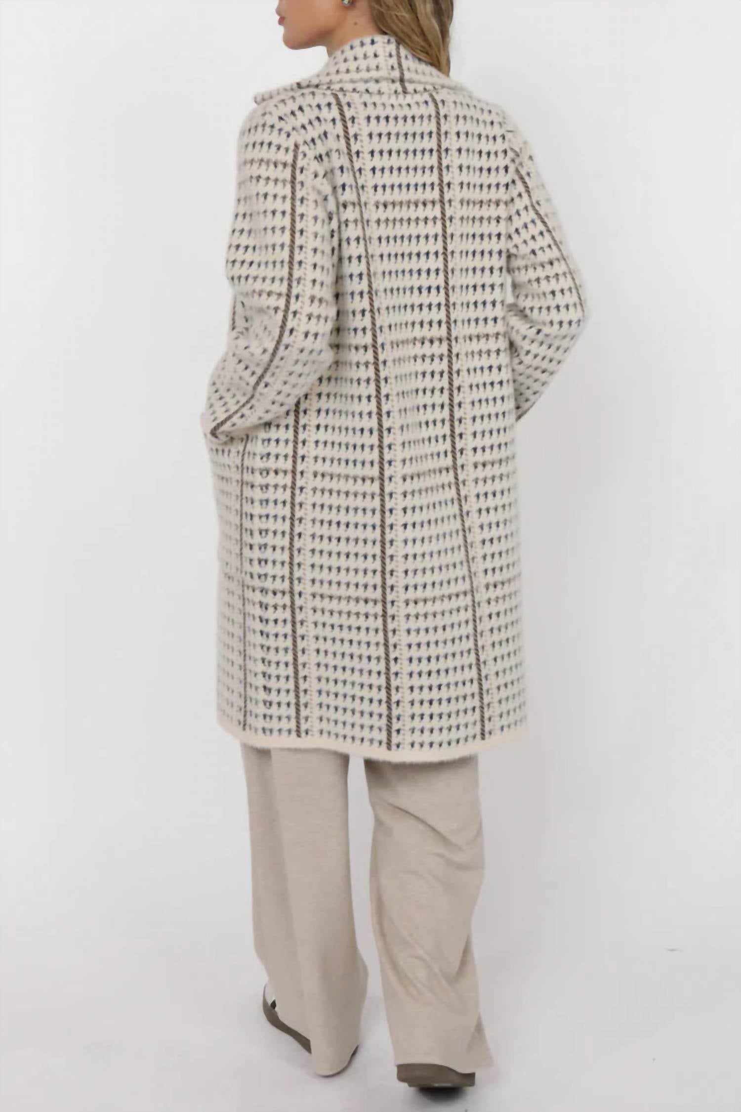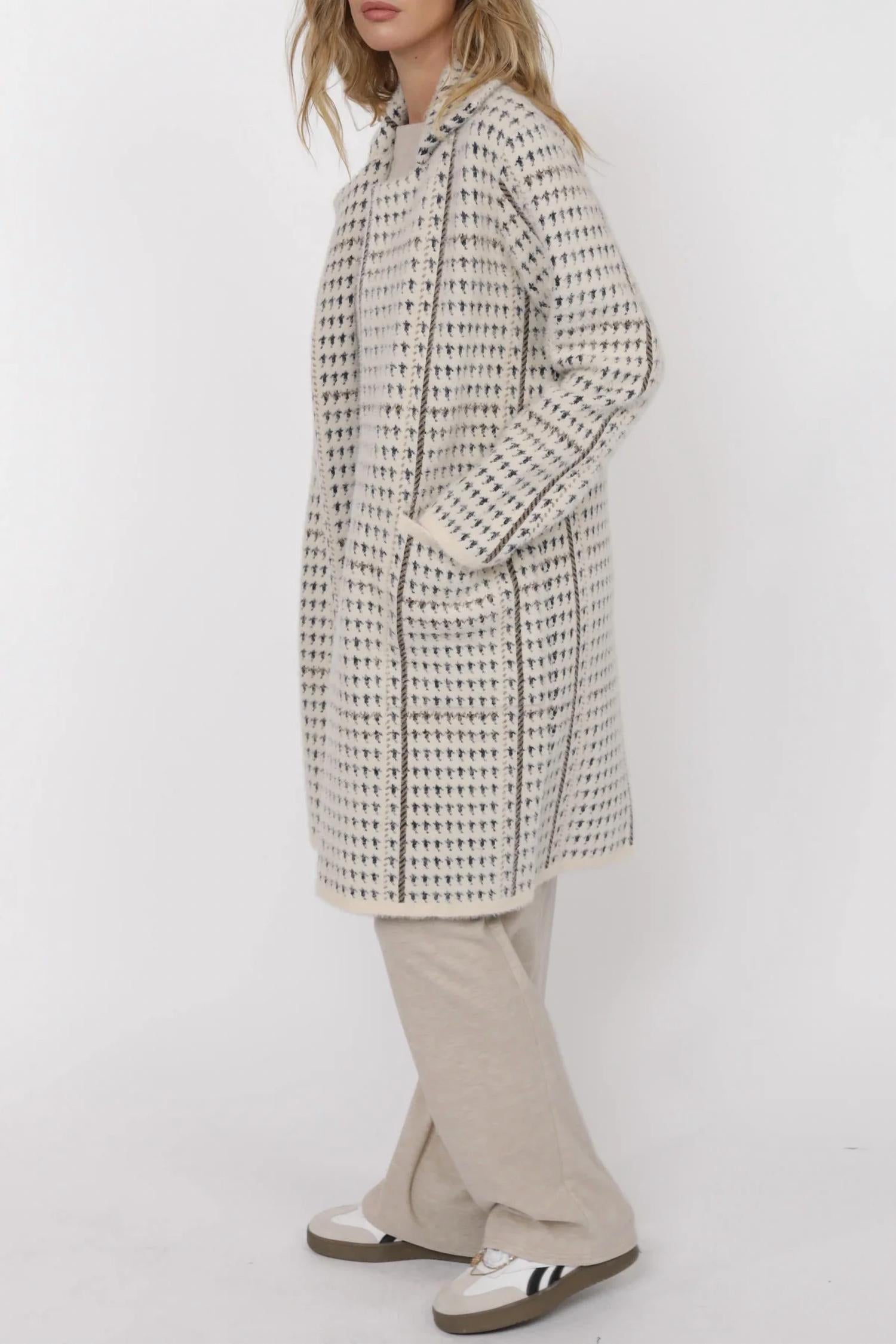 Introducing the Women's Marceau Houndstooth Coatigan by SAGE THE LABEL, a stylish addition to your fall wardrobe. This piece showcases long sleeves and is crafted from cozy sweater knit material featuring a playful plaid and check pattern. Designed with a convenient button closure for ease and lined for comfort, this coatigan is perfect for women seeking a blend of utility and elegance. Enjoy the added functionality of handy front square pockets, making it an ideal choice for cooler days.