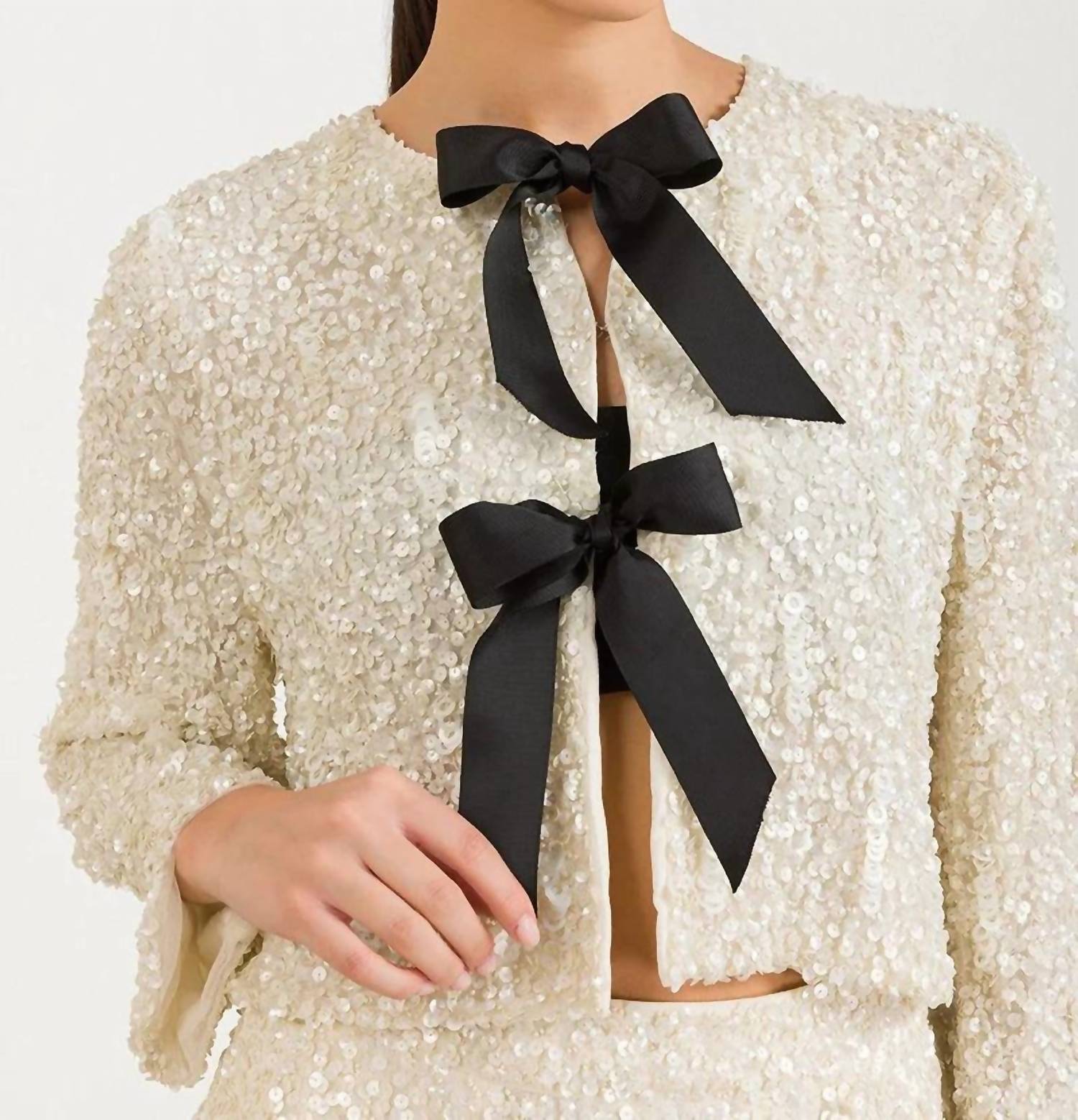 A casual yet cool jacket that every closset needs. Elevate your cocktail party ensemble with the Massima Sequin and Bead Jacket by SCARLETT POPPIES. This elegant beige jacket features long sleeves and a daring cropped length, perfect for New Year's Eve celebrations. Composed of 100% Polyester Georgette with a luxurious viscose shantung lining, it boasts an invisible front hook-and-eye closure adorned with ribbon bows. Proudly crafted with meticulous hand-embellished sequins and beads, this jacket requires dry cleaning to maintain its stunning appeal.
