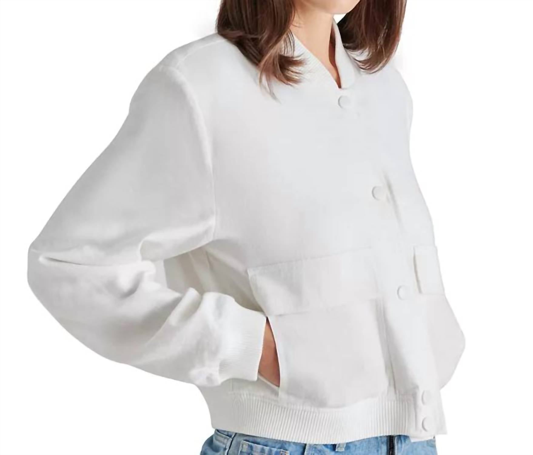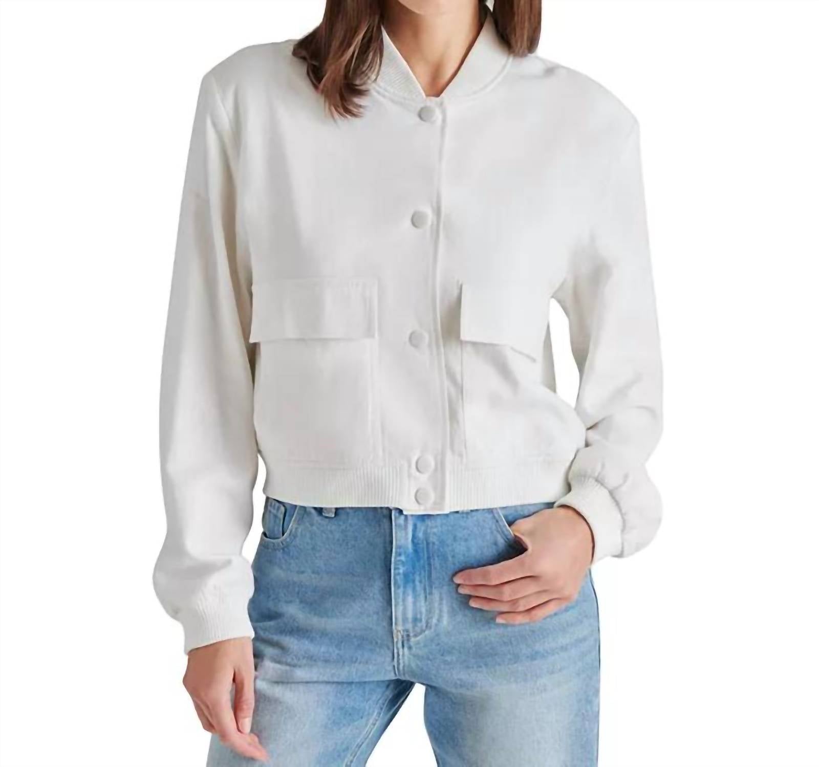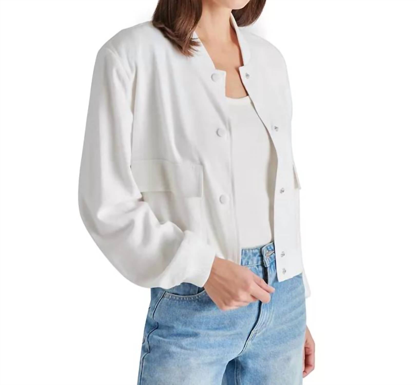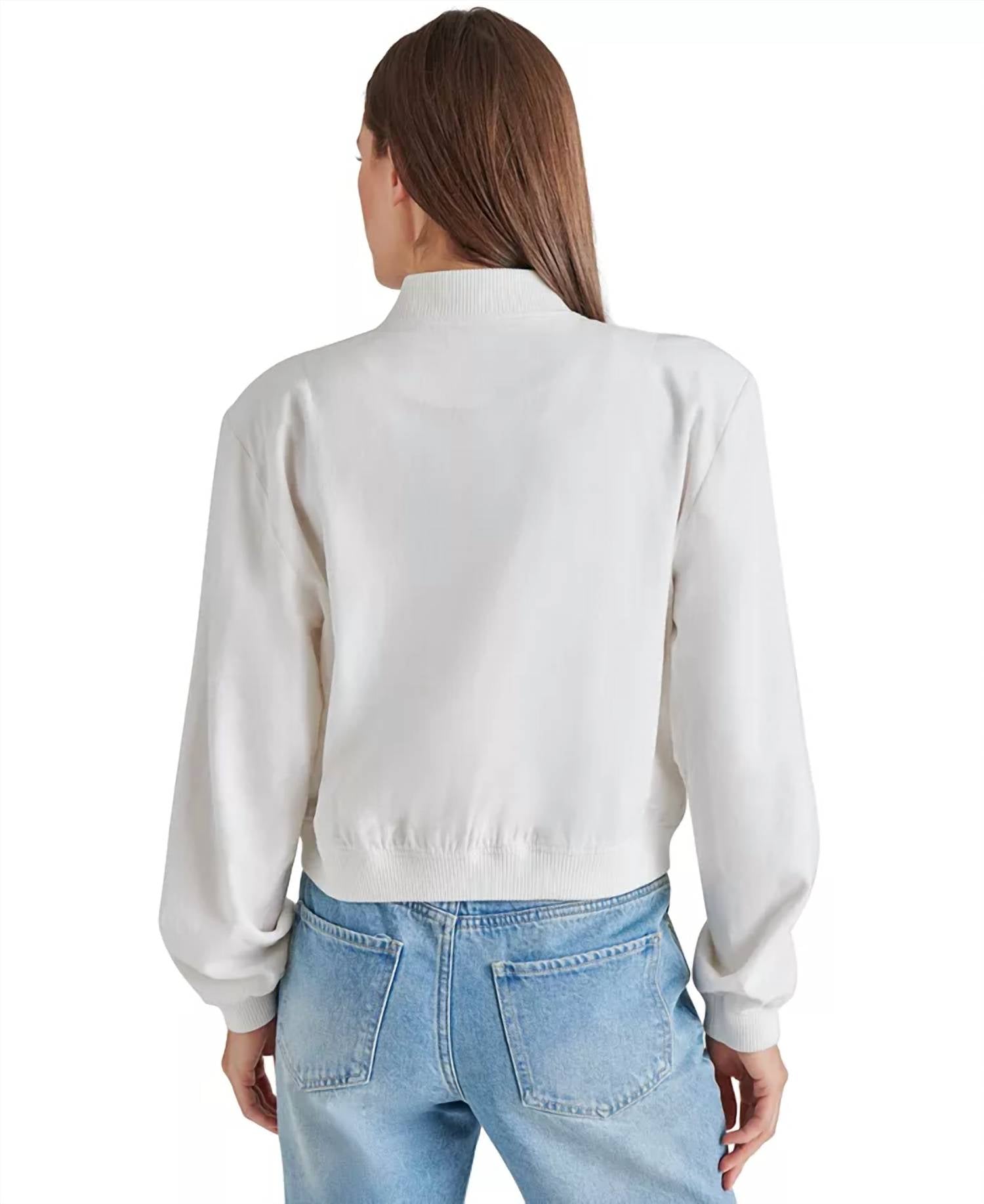 Não há nada mais legal do que esta jaqueta bomber de inspiração vintage. Eleve seu guarda-roupa de trabalho com a Jaqueta Bomber Ardine em mistura de linho da Steve Madden, uma escolha sofisticada para qualquer evento de noivado. Esta jaqueta de manga comprida combina 55% linho e 45% rayon em um branco sólido, com decote em V e bolsos práticos. Feita com cuidado, é forrada para maior conforto e fecha com um botão. Para facilitar a manutenção, basta lavar na máquina conforme necessário.