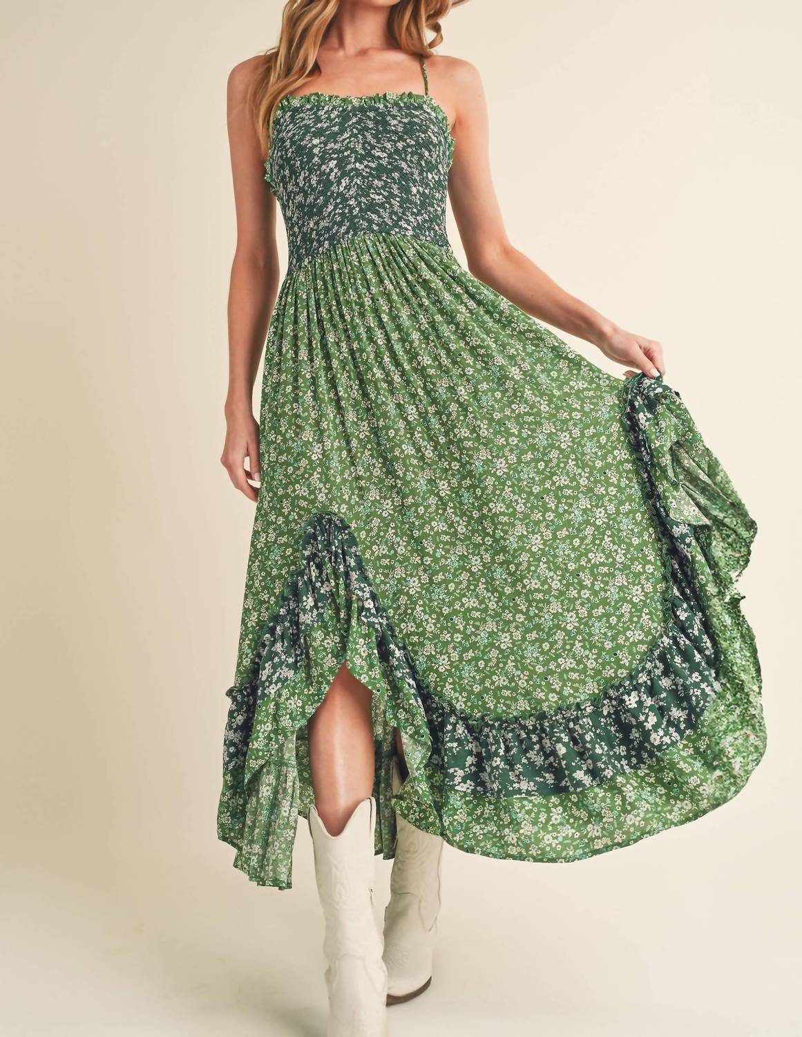 A maxi dress that is just as cute as it is comfortable. Meet the Meadowlark Maxi Dress by AEMI + CO, a perfect blend of countryside allure and modern charm designed for the boho chic trend. This green floral dress boasts delicate spaghetti straps, a smocked bodice with a lace-up back, and a high-low hem adorned with soft ruffles. Ideal for garden parties or holiday gatherings, it exudes cottagecore elegance with a playful twist. Care instructions are not specified, but pair it with boots and a wide-brim hat for an effortlessly stylish look.