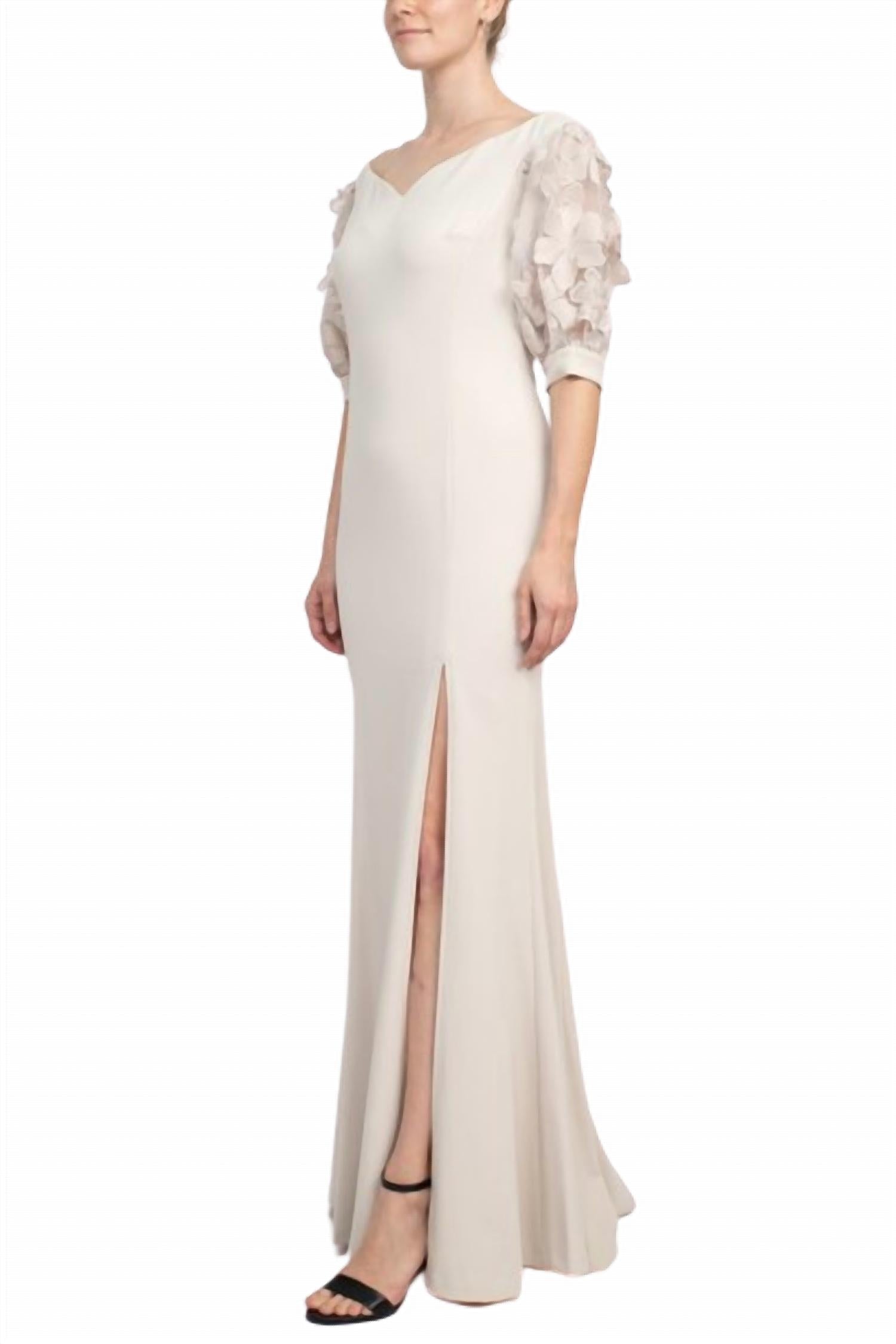 Introducing the ALBERTO MAKALI Embellished Lace Sleeve Mermaid Slit Side Gown, a stunning choice for elegant occasions. With its elbow-length lace sleeves, this taupe gown is crafted from 95% Polyester, 5% Spandex with a sleek lining to ensure both structure and comfort. Designed in a flattering mermaid silhouette, it highlights curves beautifully and features a side slit for added movement. Proudly created for women who appreciate quiet luxury, the gown secures with a back zip closure and requires dry cleaning to maintain its exquisite design.