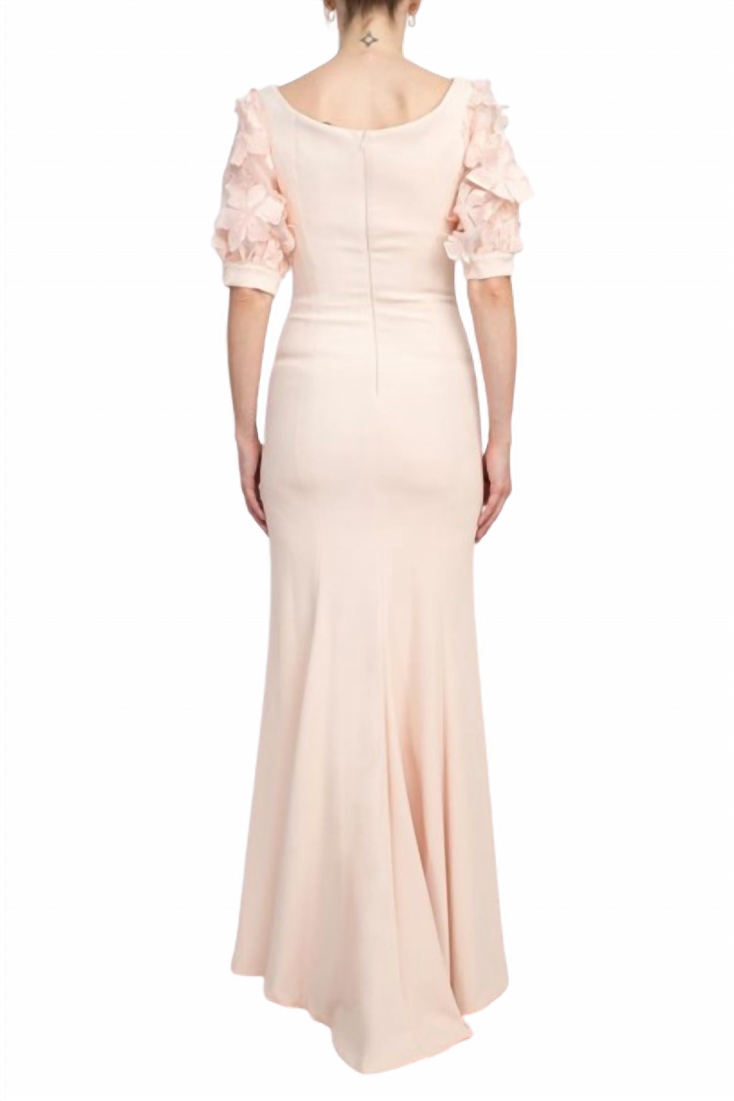 Discover the refined elegance of the Alberto Makali Off the Shoulder Lace Sleeve Mermaid Gown in a stunning rose hue. Featuring delicate short lace sleeves and a romantic off-the-shoulder neckline, this gown is crafted from premium scuba fabric with 95% polyester and 5% spandex for a perfect blend of structure and comfort. Designed as a maxi silhouette, the mermaid cut elegantly enhances your curves, complete with a side slit for added movement and allure. Closure: Zip closure. Care: Dry clean only to maintain its exquisite lace detailing and chic silhouette.