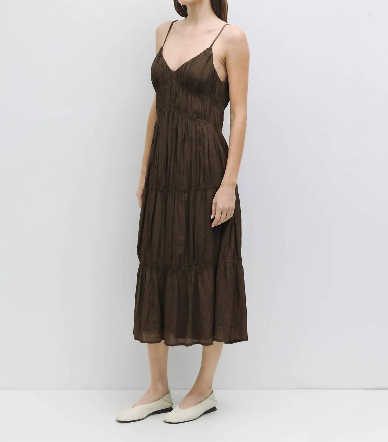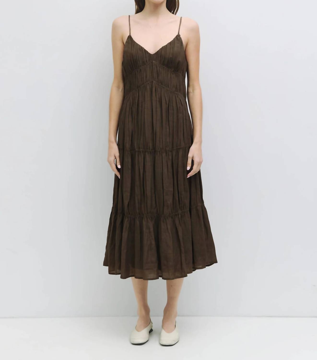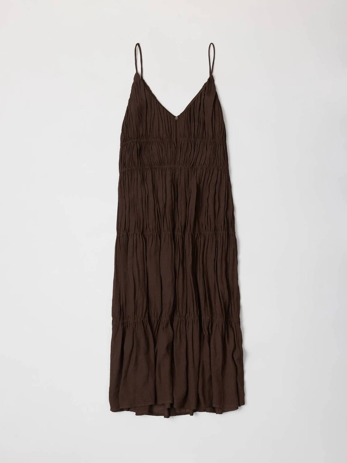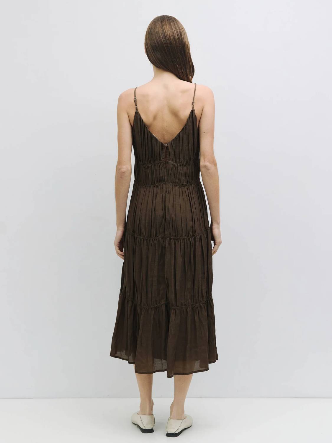 Conheça o vestido Kendra da All: Row, um item essencial para o seu guarda-roupa de verão em um elegante tom marrom cacau. Este vestido midi evasê possui alças finas e um decote em V charmoso, perfeito para qualquer ocasião, desde viagens de férias até jantares de Ação de Graças. Confeccionado em rayon luxuoso, oferece uma estampa lisa chique e um fecho de botão seguro para realçar seu estilo. As instruções de cuidado incluem lavagem à mão e secagem no varal para manter seu charme.