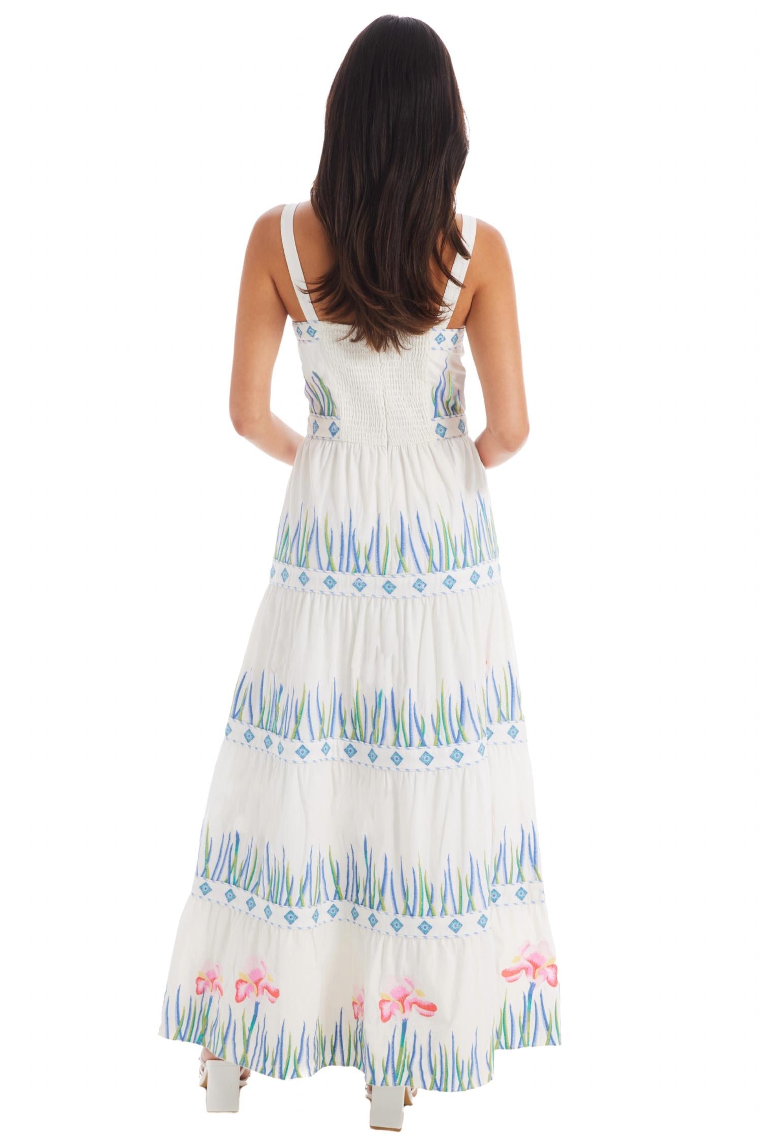 Style this maxi with your favorite statement necklace and sandals for the perfect look. Discover the Embroidered Lila Dress by ALLISON NEW YORK, a captivating blend of elegance and embroidery in White Multi. This sleeveless masterpiece, crafted from 100% cotton, features a charming sweetheart neckline and an A-line silhouette, accentuated by a tiered maxi skirt measuring 48.25 inches in length. The dress offers a comfortable fit with a smocked bodice and adjustable straps, finished with a zip closure at the back. Care for this exquisite piece by hand washing in cold water and laying flat to dry.