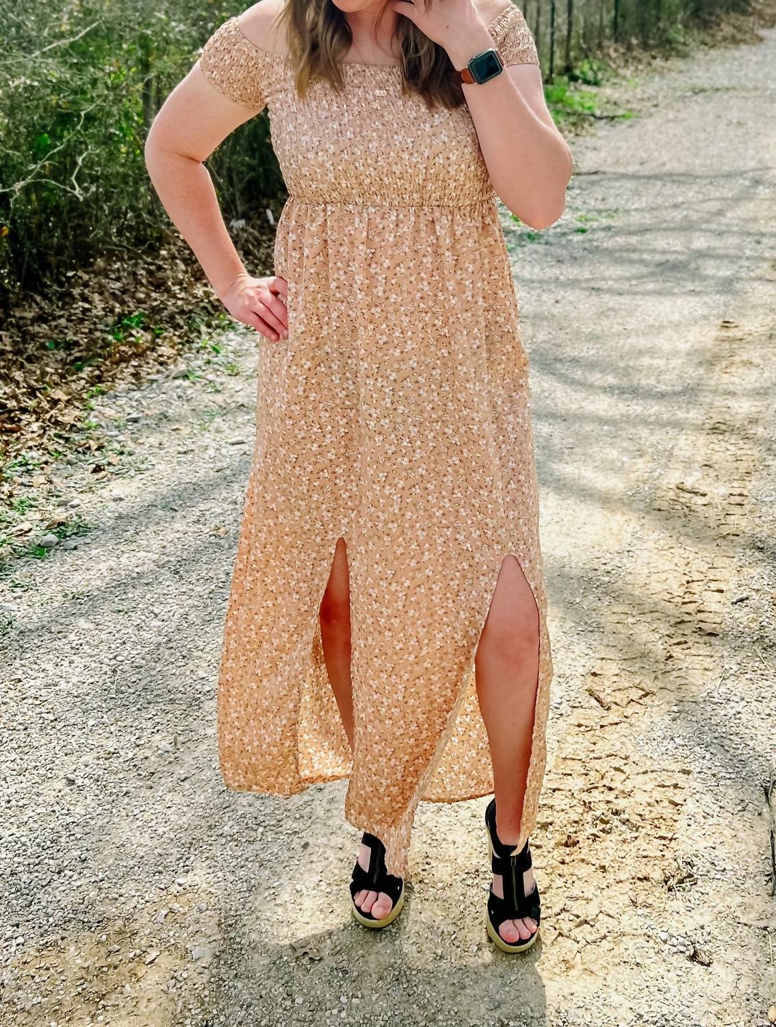 Style this maxi with your favorite statement necklace and sandals for the perfect look. Discover the Bailey Maxi Dress by Amoli, a boho chic masterpiece perfect for your next vacation or spring occasion. This off-the-shoulder design features short, fitted, non-slip sleeves and a stunning floral print in blush tones. Crafted from 100% polyester, it showcases exquisite smocking detail and a mermaid silhouette for a flattering fit. Closure: Pull-on. The model is wearing a size small and measures 5'4", 138 lbs, with a 34B bust.