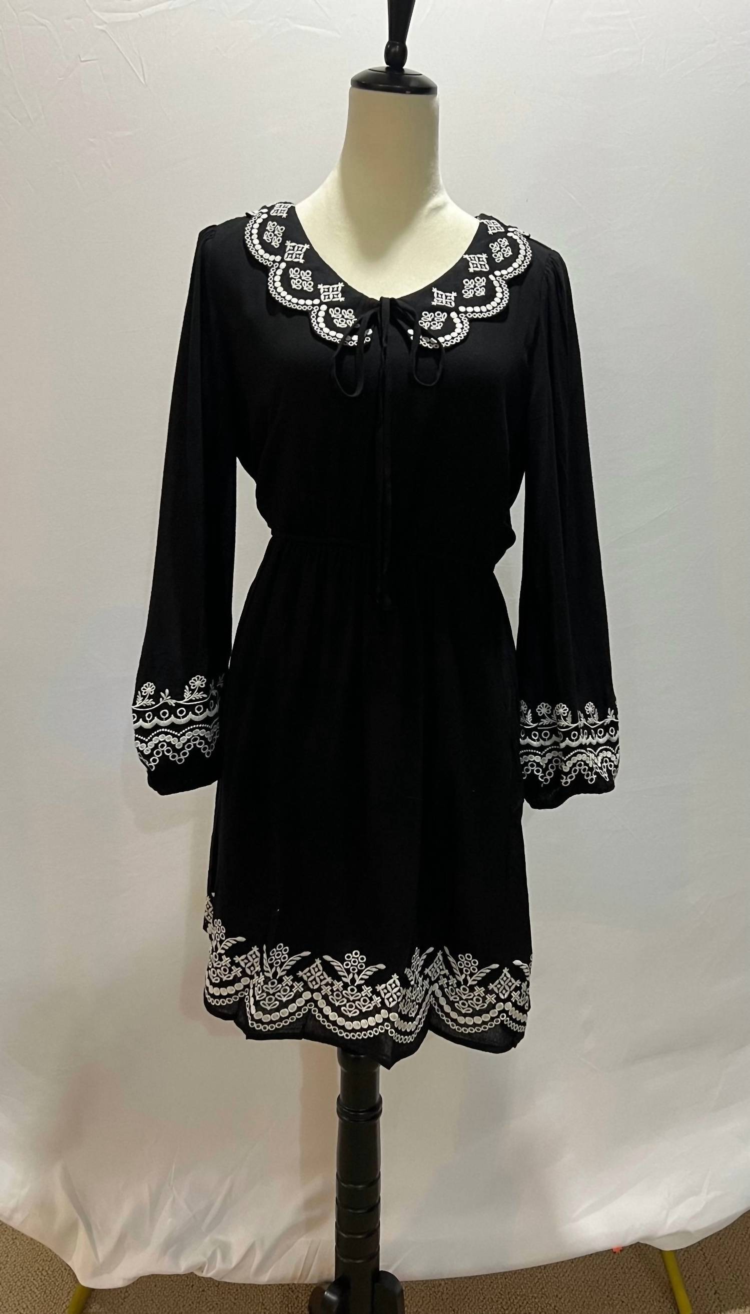 The pefect long sleeve dress for those cooler months. Discover the Embroidered Woven Dress by ANDREE BY UNIT, a boho chic staple in solid black. This A-line silhouette dress features long sleeves and charming embroidery along the neckline, sleeves, and hemline. Crafted from 100% Rayon, it offers a graceful scoopneck and a comfortable pull-on closure. Perfect for a holiday party in the fall season.