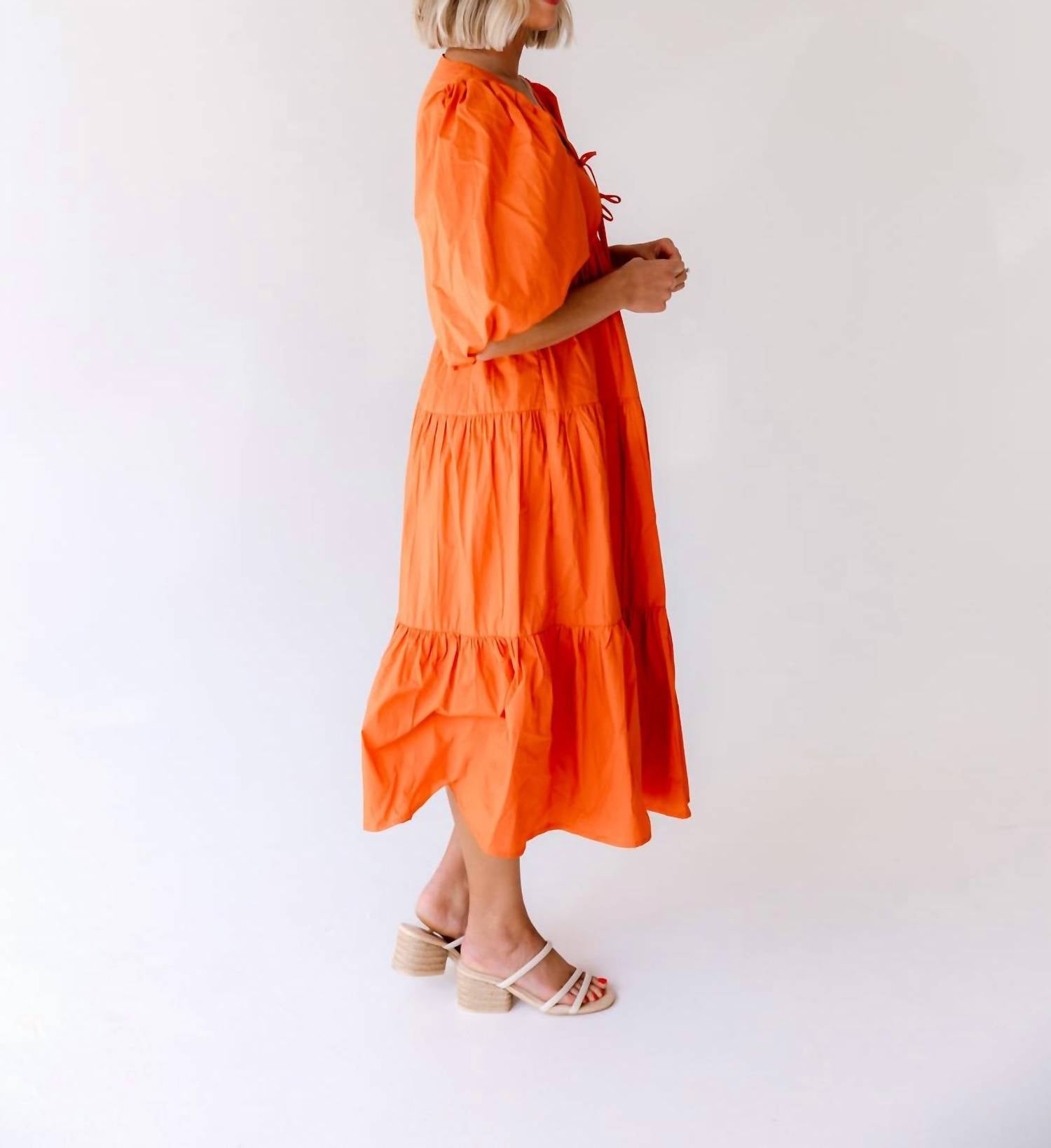 Introducing the Marcy Tiered Midi Dress by Aureum in vibrant Chili, perfect for your fall wardrobe. This A-line dress features playful elbow puff sleeves and a flattering V-neckline, complete with a stylish tiered design for flirty movement. The textured pattern and tie closure add unique touches, making it suitable for vacation or minimalist occasions. Model is wearing a size small (5'6" height, 35.5" chest, 27" waist, 36.5" hip).