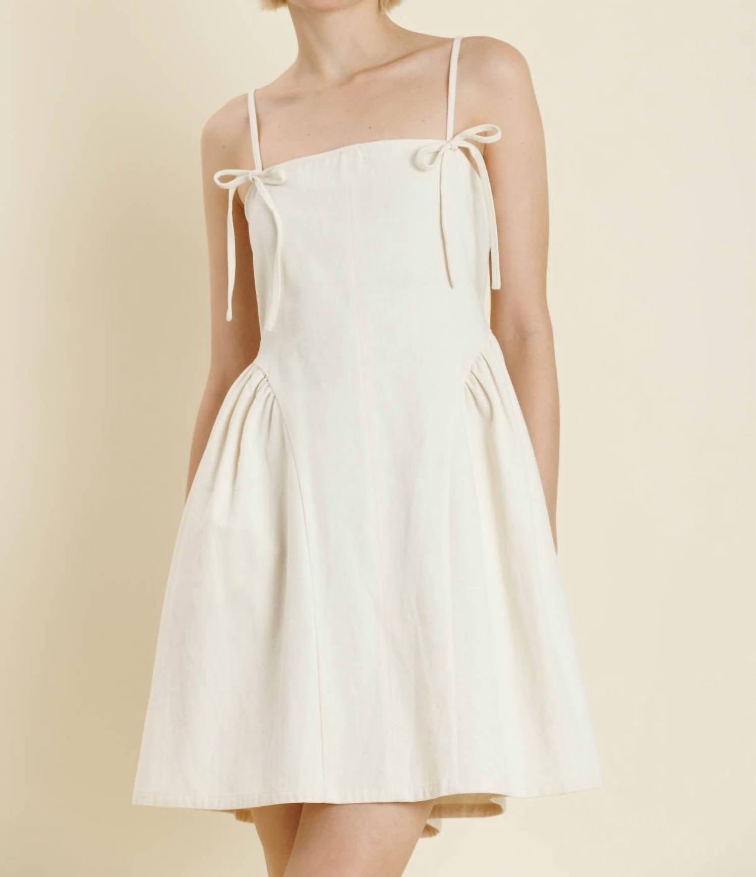 Introducing the Stevie Bow Trim Mini Dress by Aureum, a delicate cream piece crafted for minimalist summer elegance. Designed with spaghetti straps and a flattering squareneck, this mini dress boasts a solid 100% cotton composition that's both lightweight and breathable. Closure is achieved with charming tie details, enhancing its playful yet polished aesthetic. Care for this versatile dress with machine wash and tumble dry settings, ensuring it's ready for your next holiday party or casual outing.