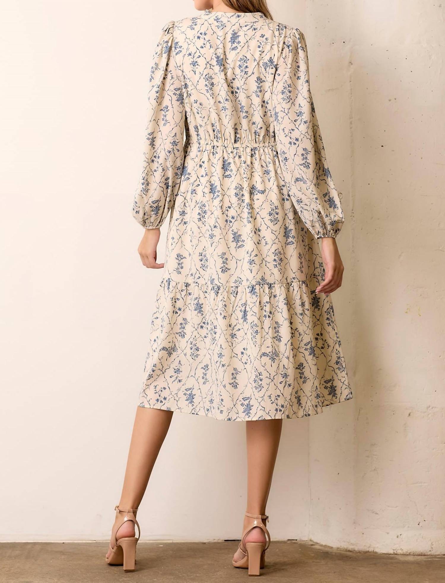 Just add slides or mules and you are good to go. Step into elegance with the Rosie Floral V-neck Dress by Baevely by Wellmade, a chic choice for any spring event. This women's dress boasts long sleeves with elastic cuffs and a refined V-neckline, featuring a beautiful cream blue multi floral pattern. Crafted from soft 100% Polyester, it offers an A-line silhouette with convenient pockets and a whimsical bottom tier detail at the back. Closure: Pull-on. Perfect for boho chic holiday parties.