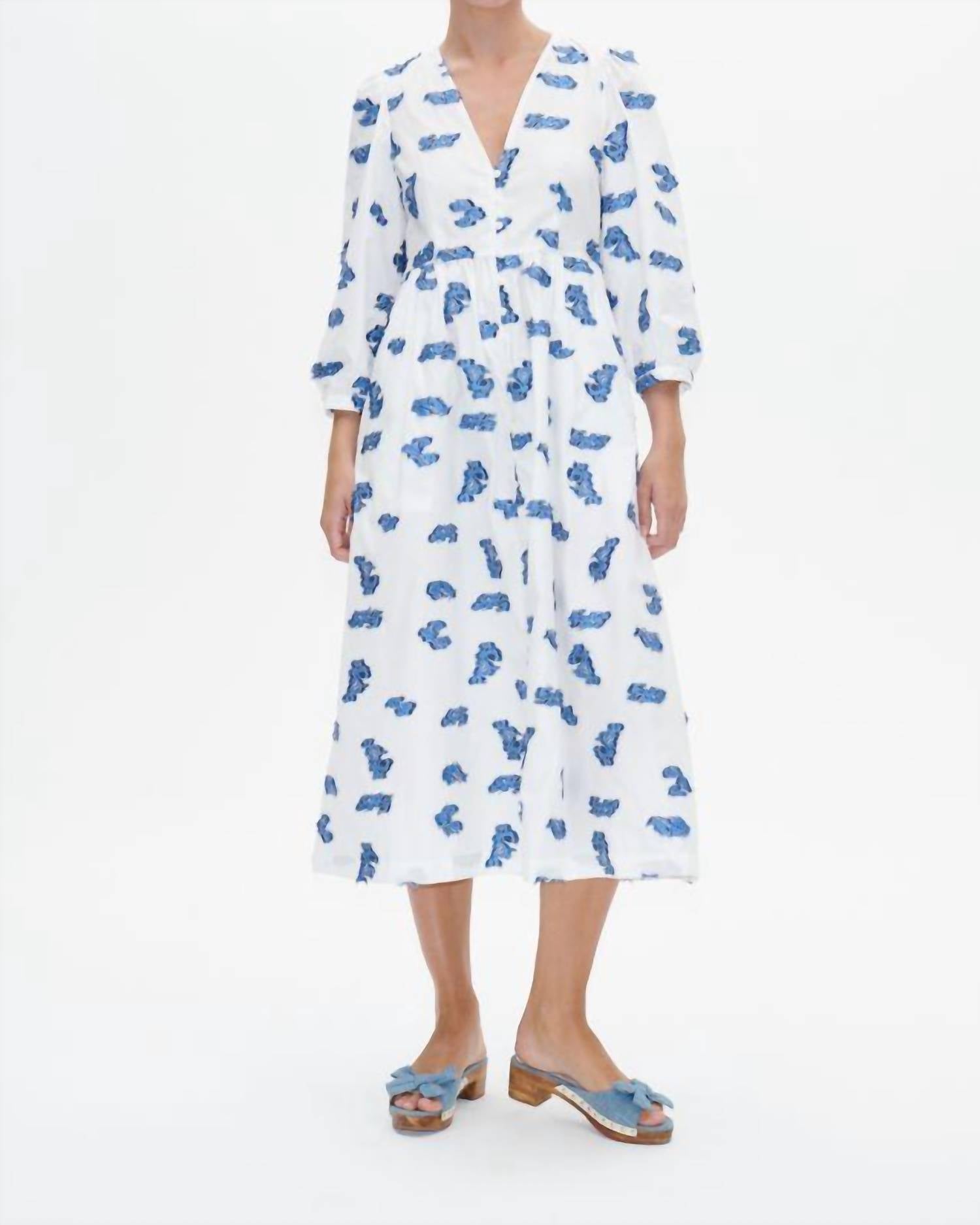 Just add slides or mules and you are good to go. Introducing the Asina Midi Dress by BAUM UND PFERDGARTEN in a delightful Blue Blouquet, crafted for the sophisticated woman. This A-line dress features three-quarter sleeves and jacquard detailing, complemented by a V-neck design. Made from a blend of 84% Polyester and 16% Cotton, it boasts button closures down the front and a convenient zip closure at the side. This patterned piece, ideal for a holiday party, requires dry cleaning and should be line dried.