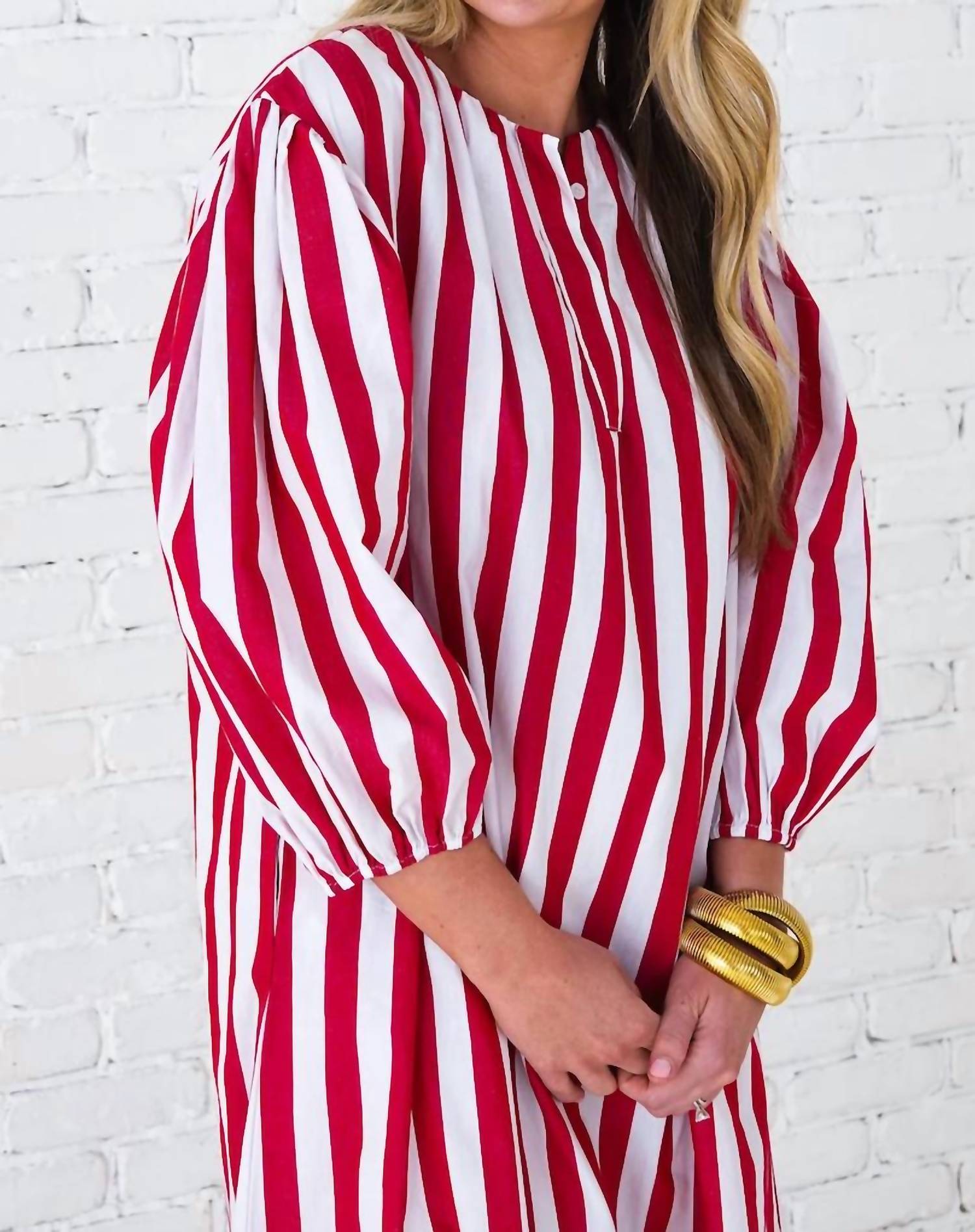 Embrace effortless style with the Caryn Lawn Cabana Maxi Dress, perfect for a summer vacation look. Featuring three-quarter sleeves and a classic shift silhouette, this dress comes in a vibrant red stripe pattern that exudes boho chic vibes. Designed with a collared neckline and handy pockets, it offers the convenience of a pull-on closure. Care is made simple with machine wash and tumble dry instructions, while the one-size-fits-most design accommodates sizes 4-12.