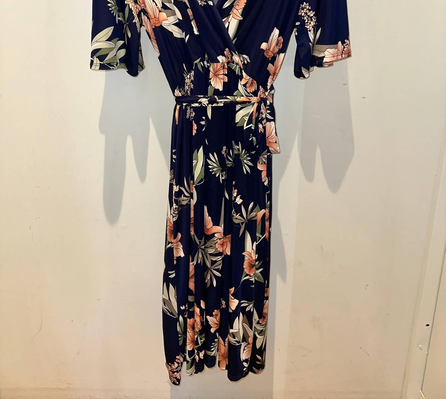 Just add slides or mules and you are good to go. Boho chic essential perfect for spring gatherings. Midi dress features three-quarter flutter sleeves and a flattering V-neckline, adorned with a vibrant floral pattern in light orange and green against a navy blue backdrop. Emphasizing style and comfort, includes a tie closure that cinches the waist beautifully. Ideal for Easter housewarmings. Captures effortless elegance without added fuss. Perfect for plus size.