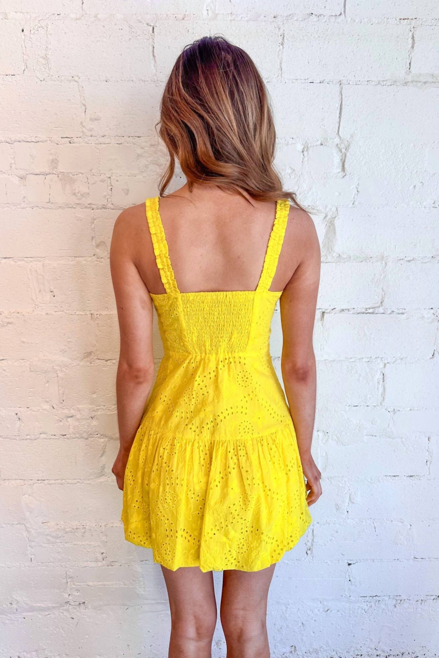 Um vestido curto e arejado para os dias mais quentes. Aposte no vestido Eyeing You Bubble by day + moon em amarelo vibrante, ideal para elevar o seu guarda-roupa de verão. Este minivestido sem mangas apresenta um corte em A diferenciado, com bainha divertida em formato de bolha e um decote coração charmoso. Confeccionado em 100% algodão, garante respirabilidade e conforto, sendo ideal para férias ou eventos diurnos elegantes. As instruções de cuidado recomendam lavar à mão e secar no varal para manter o estilo texturizado.