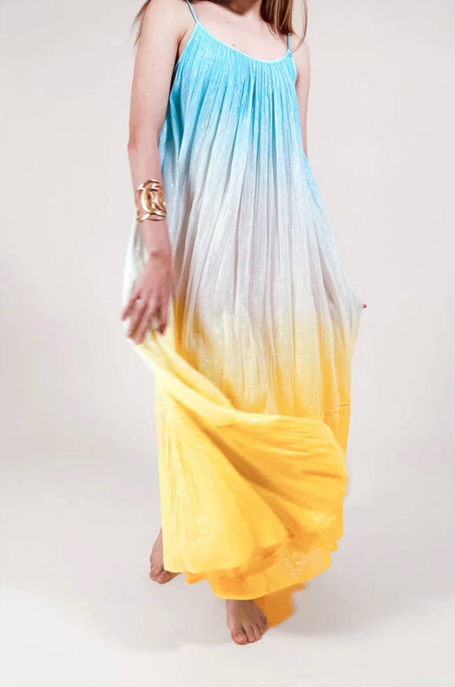 Um vestido longo que é tão fofo quanto confortável. Obra-prima boho-chic em tie-dye turquesa vibrante e limão. O vestido longo possui alças finas e corte reto, com detalhes metálicos e bainha divertida com babados. Confeccionado em voil estruturado 100% algodão. Oferece um caimento relaxado e fresco, perfeito para dias de praia. Estilo pull-on. Lavagem à mão.