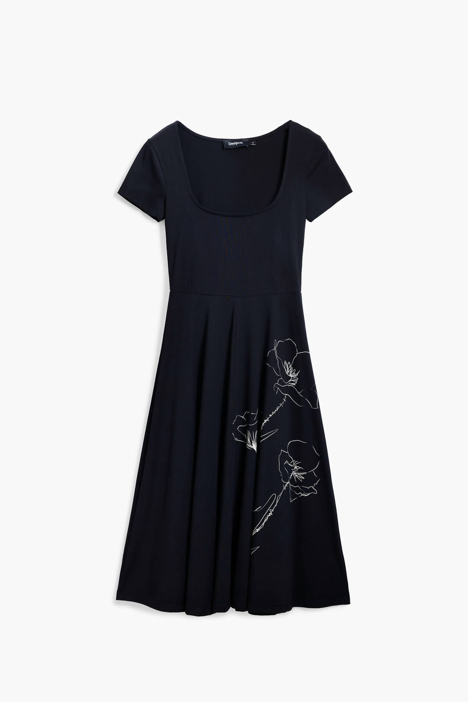 Vestido midi de algodão com decote aberto e saia rodada com estampa floral na silhueta.