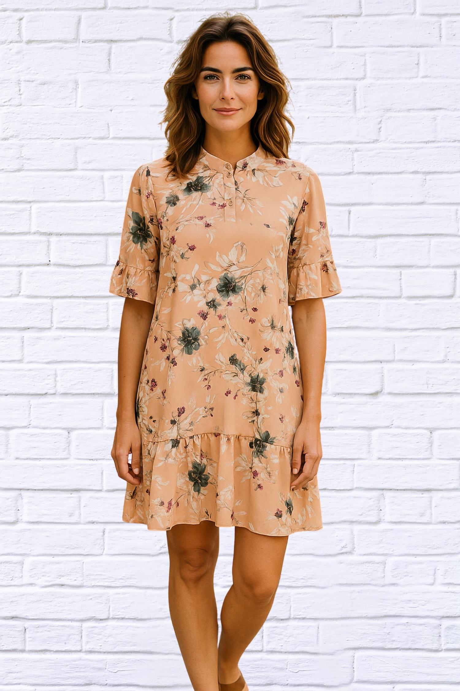 A short and breezy dress for those warmer days. Introducing the Peach Floral Dress by Diva USA, a refined choice for spring occasions. This women's mini floral dress features three-quarter sleeves embellished with frills and a charming frill hemline for added elegance. Crafted purely from polyester, it boasts a stylish Chinese neckline with a three-button closure, complemented by functional side pockets. Originating from USA and designed for effortless care, simply machine wash for long-lasting beauty.