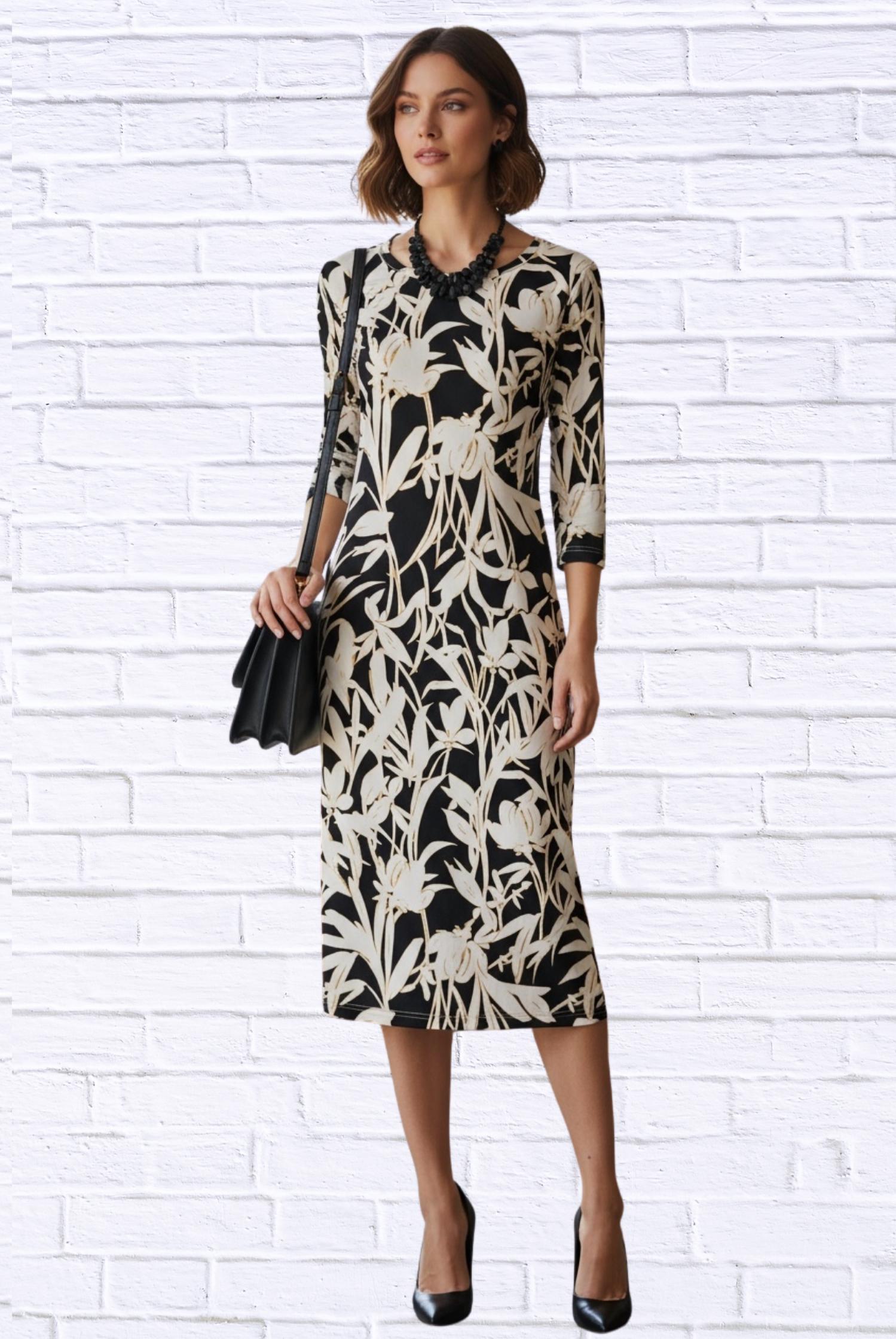 The perfect length dress does exist. Elevate your wardrobe with Diva USA's Floral Knit Midi Dress, a sophisticated piece that promises to flatter with its timeless elegance. This dress is expertly crafted from premium Bon Bon knit fabric, offering stretch comfort with a wrinkle-resistant finish, perfect for travel. It features three-quarter sleeves and a crewneck, all in a classic black and ivory floral print that suits both work and special occasions. With a slip-on style, there's no need for zippers or buttons, and it's easy to maintain with machine wash care.
