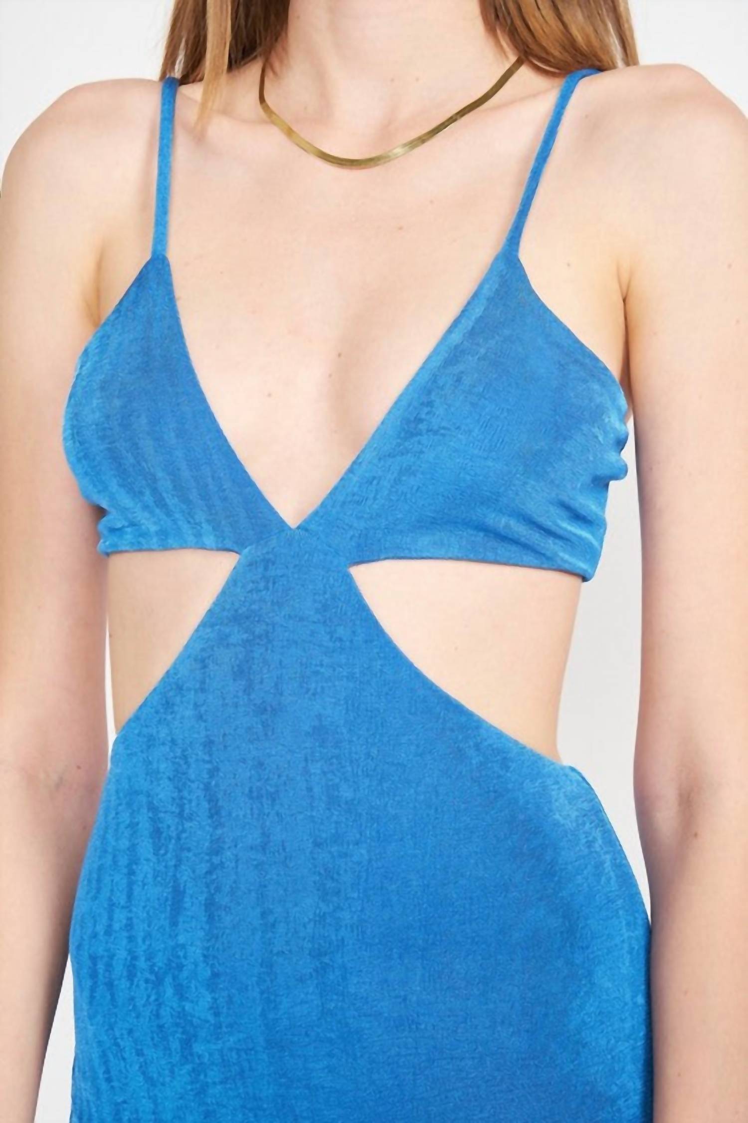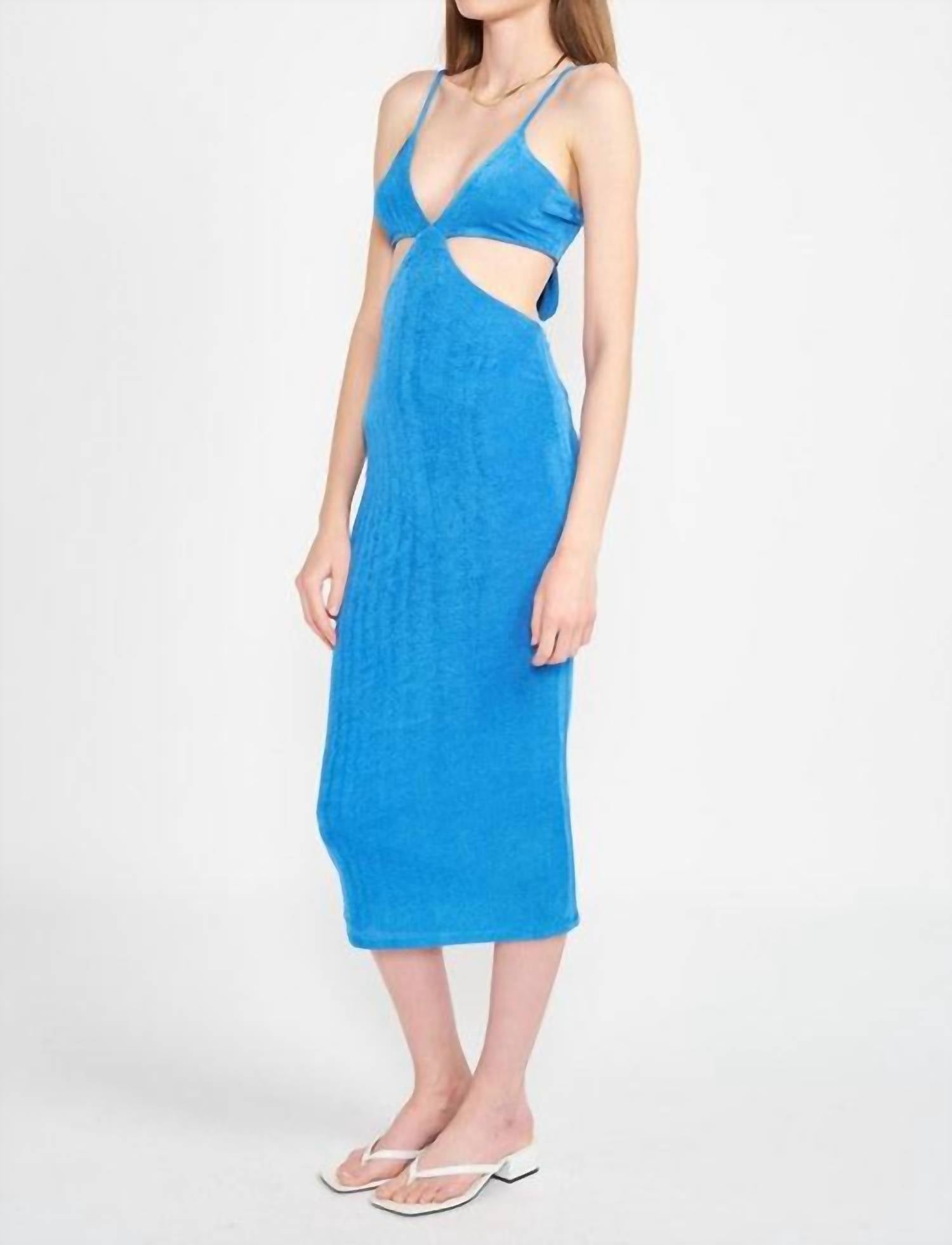 Just add slides or mules and you are good to go. Embrace elegance with the Maci Cutout Midi Dress from Emory Park, a stunning choice for your holiday gatherings. This dress features spaghetti straps and a bodycon silhouette in a solid aqua hue, perfect for minimalist summer style. Made from durable polyester, it boasts a V-neckline with a chic tie closure for added allure. Please note this item ships directly from the warehouse within 10 business days. Model wears size small and stands at 5'9".