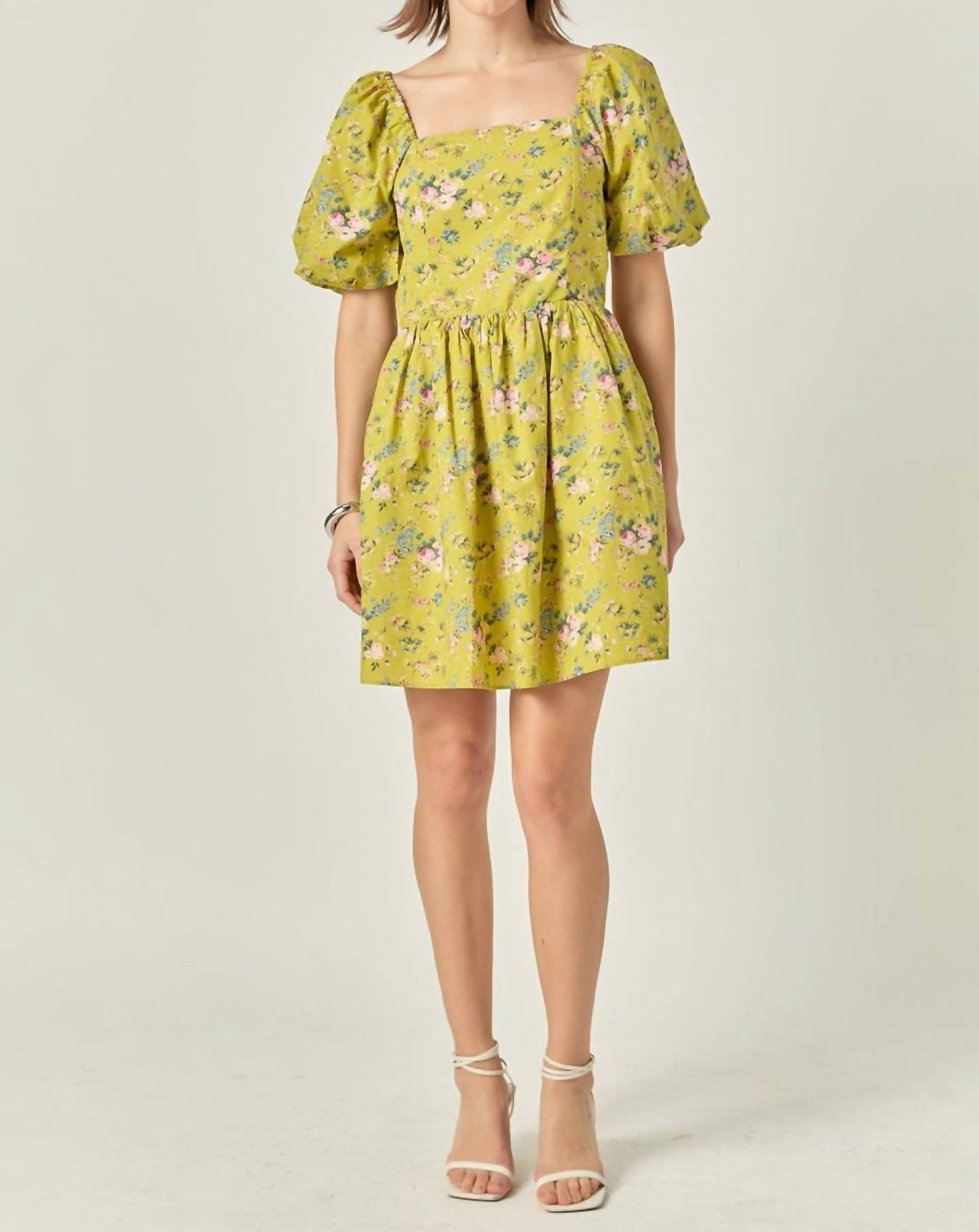 The kind of easy and flattering dress you'll be reaching for all season long. Embrace the spirit of summer with the Floral Back Cutout Dress by English Factory in a refreshing celery color. This women's mini dress features short blouson sleeves and a stylish square neckline, finished with a charming back cutout detail with tie closure. The floral pattern and side seam pocket add functional beauty, while the shell is crafted from 100% Polyester with a comfortable lining of 80% Polyester and 20% Cotton. Care for this delightful dress with hand washing to maintain its airy silhouette.