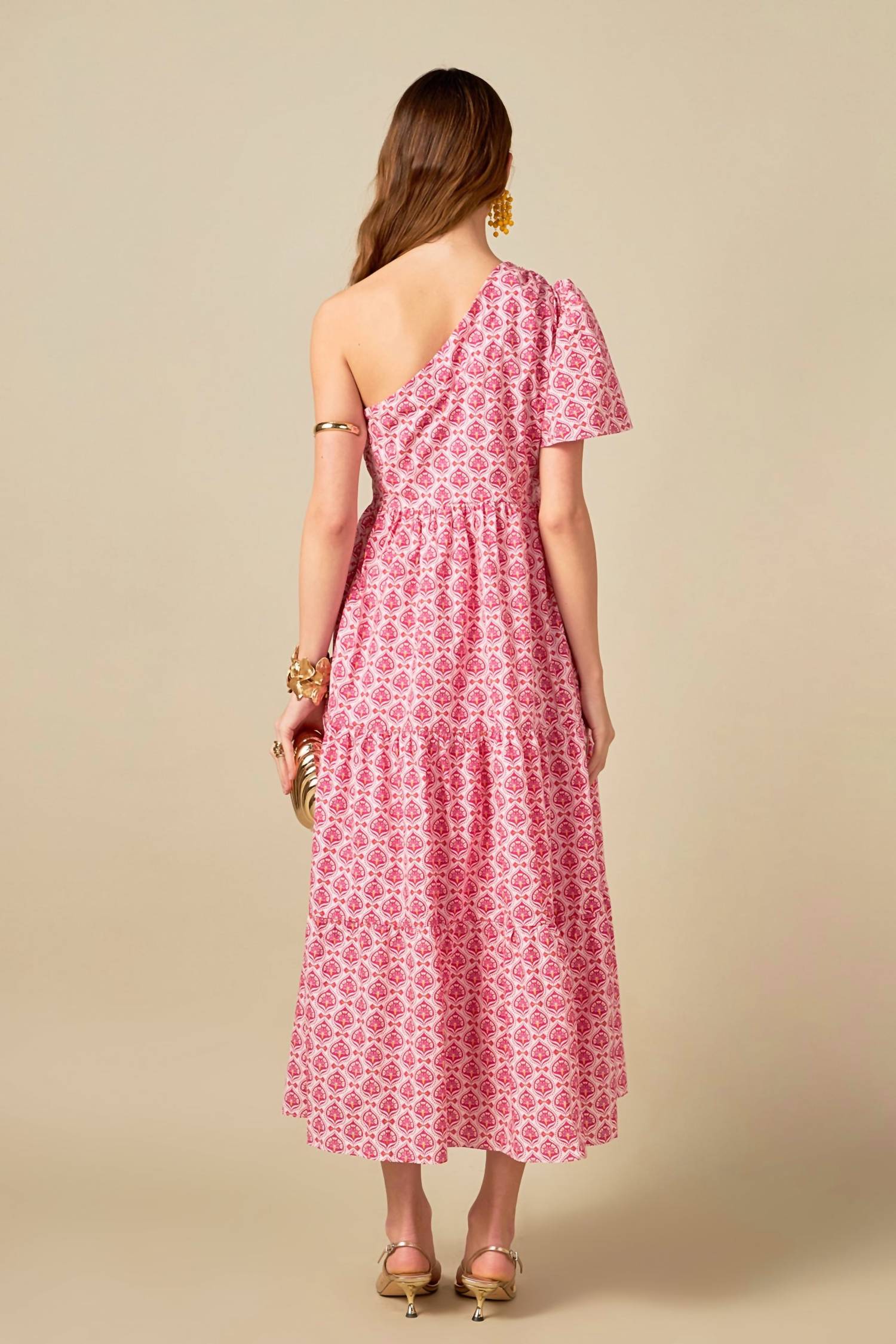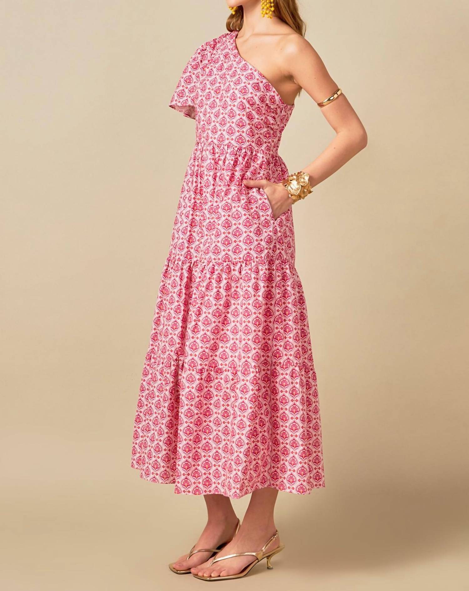 Quem não ama um bom vestido longo? Este você vai usar em todas as estações. Eleve seu guarda-roupa de verão com o vestido longo floral English Factory de um ombro só em um rosa charmoso. Este vestido longo estampado com corte em A exibe um estilo Boho Chic moderno com manga curta e decote ombro a ombro, perfeito para eventos noturnos como o Dia de Ação de Graças. Confeccionado em algodão confortável, com fecho prático de zíper, ele ainda conta com bolsos para maior praticidade. Para mantê-lo sempre impecável, basta lavá-lo à mão conforme necessário.