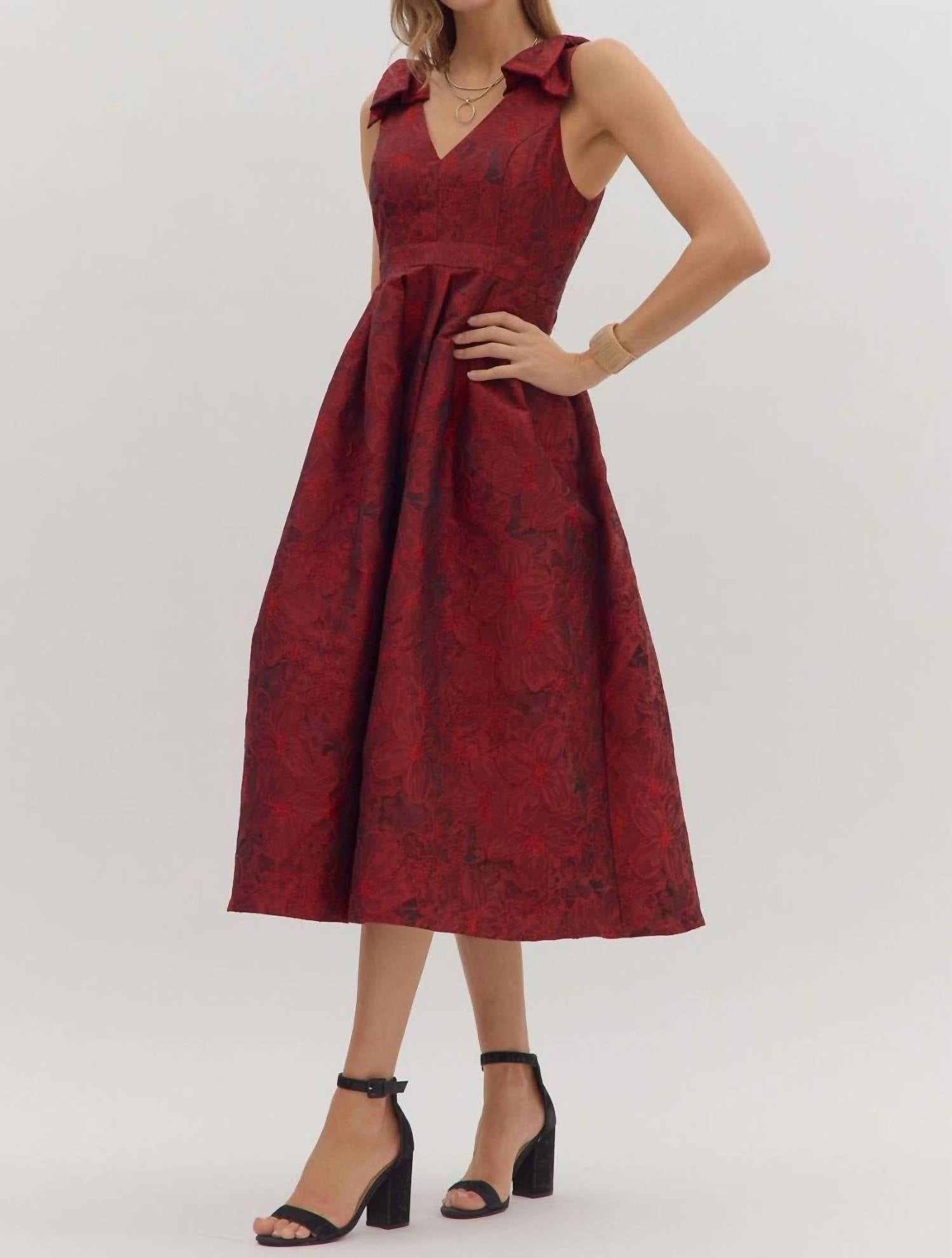 Make a statement at your next event with the Celebration Midi Dress by Entro, an embodiment of quiet luxury in a striking red shade. This sleeveless dress is crafted from 100% polyester and boasts a floral jacquard fabric with chic bow accents on the shoulder straps. Featuring a graceful pleated A-line skirt and convenient side pockets, this design ensures both elegance and practicality. The discreet zip closure at the back provides a seamless fit, making it an excellent choice for spring dinners and Christmas parties alike.