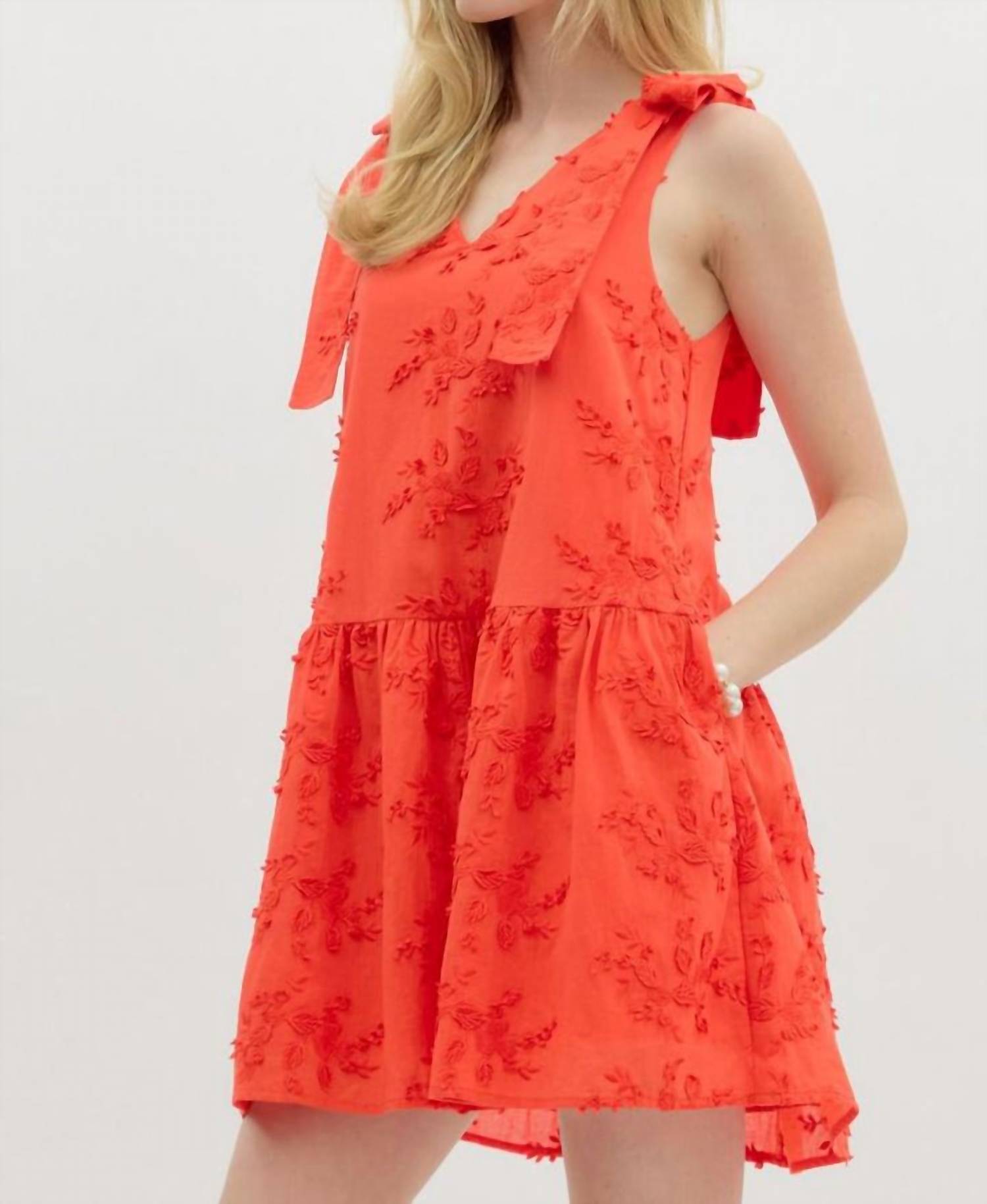 The kind of easy and flattering dress you'll be reaching for all season long. This charming sleeveless dress features a flattering V-neck and delicate bow tie shoulder straps. The design is embellished with 3D floral appliqués for a decorative touch. Made from 100% cotton, the fabric is woven, lightweight, and non-sheer. For comfort and convenience, the dress is lined and includes functional pockets at the sides.