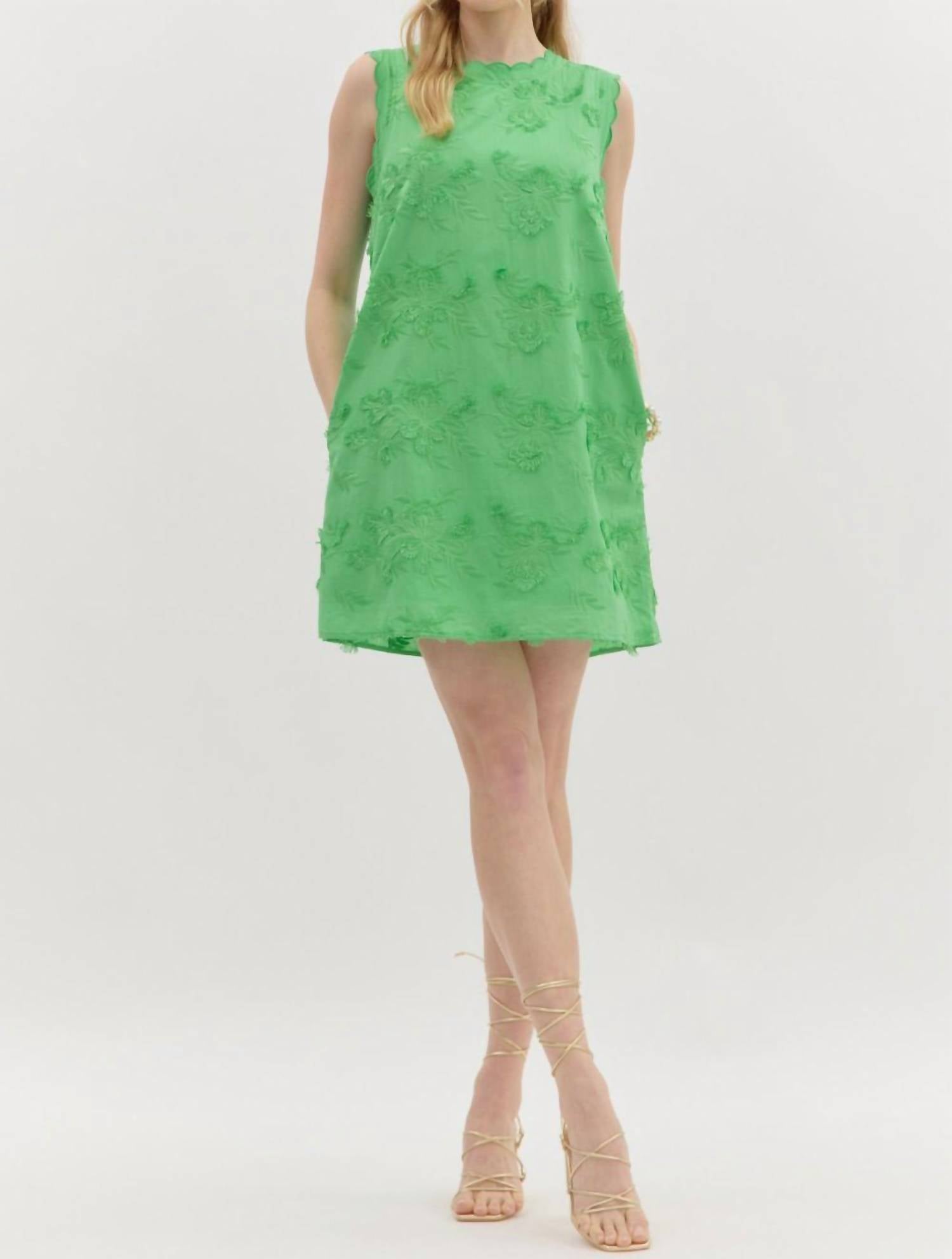 The kind of easy and flattering dress you'll be reaching for all season long. Elevate your summer wardrobe with the Sleeveless Floral Appliqué Mini Dress by Entro, featuring intricate 3D floral appliqués and a chic embroidered scallop finish. This lightweight shift dress comes in an eye-catching Kelly Green hue, crafted from a 50% Cotton, 50% Polyester blend, ensuring comfort and style. The sleeveless mini design includes practical side pockets and a convenient single button keyhole closure at the back. With a classic crewneck silhouette, this non-sheer, lined dress is perfect for warm-weather outings.