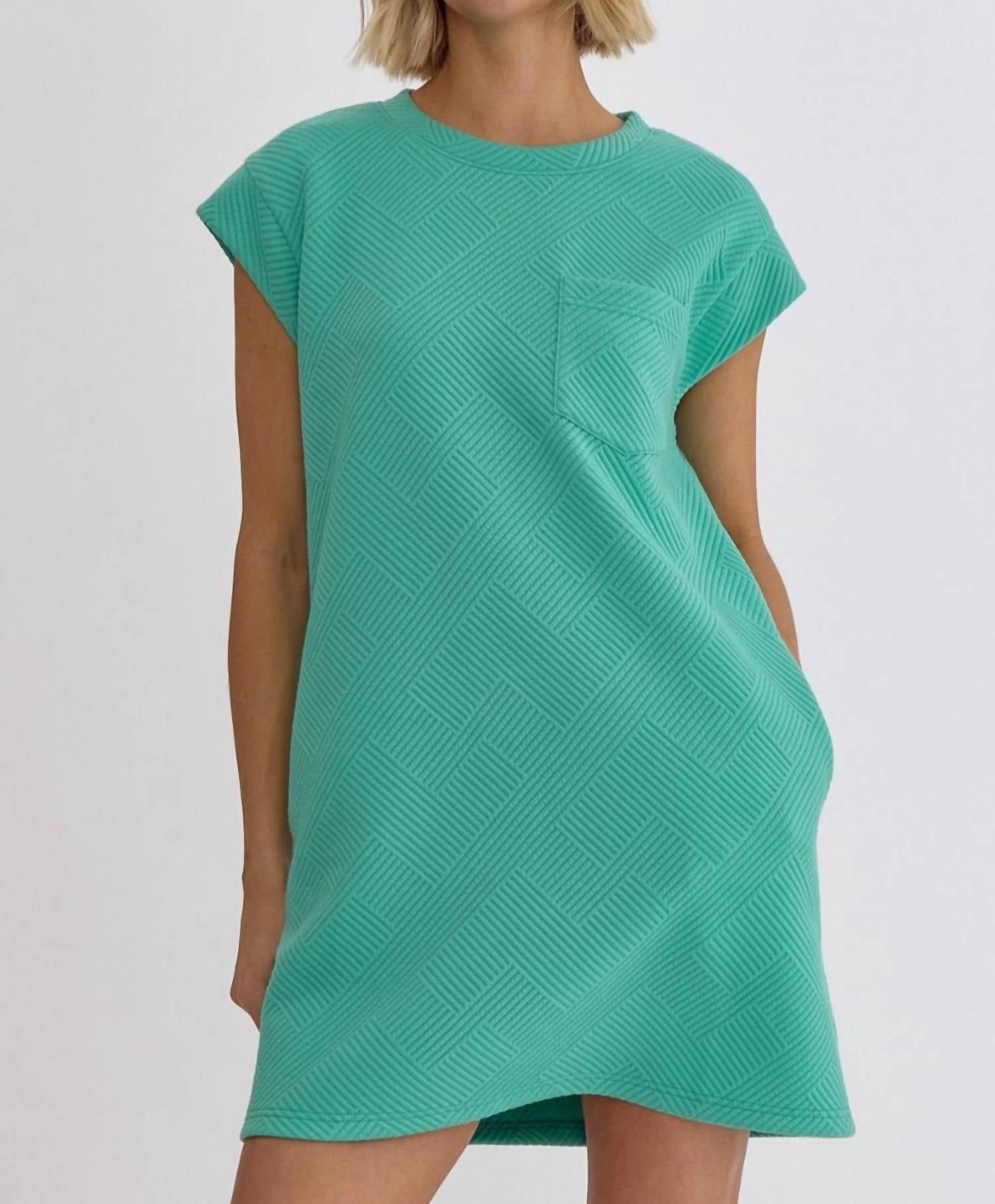 The kind of easy and flattering dress you'll be reaching for all season long. Textured round neck sleeveless mini dress featuring single pocket at bust. Pockets at side. Unlined. Knit. Non-sheer. Lightweight.