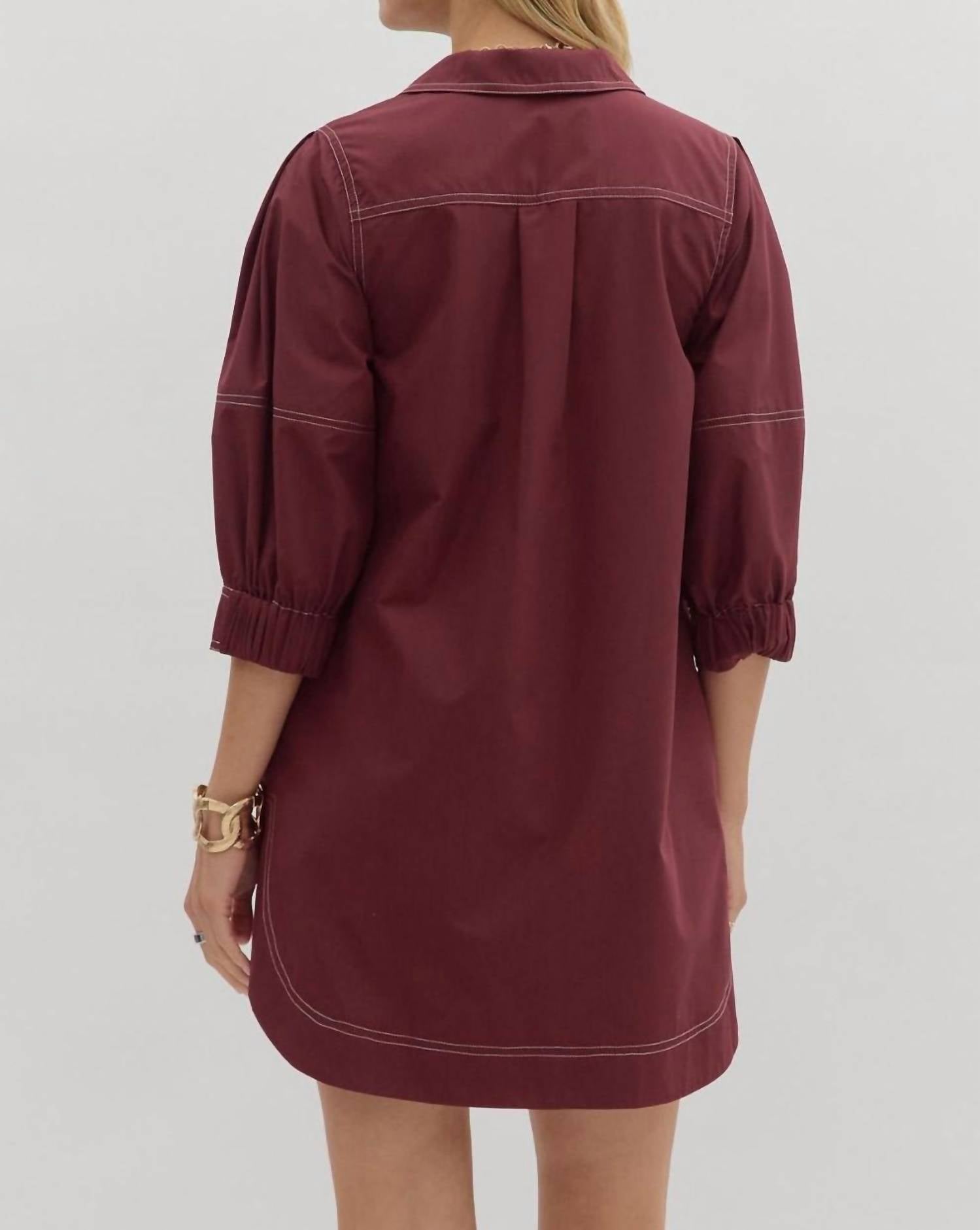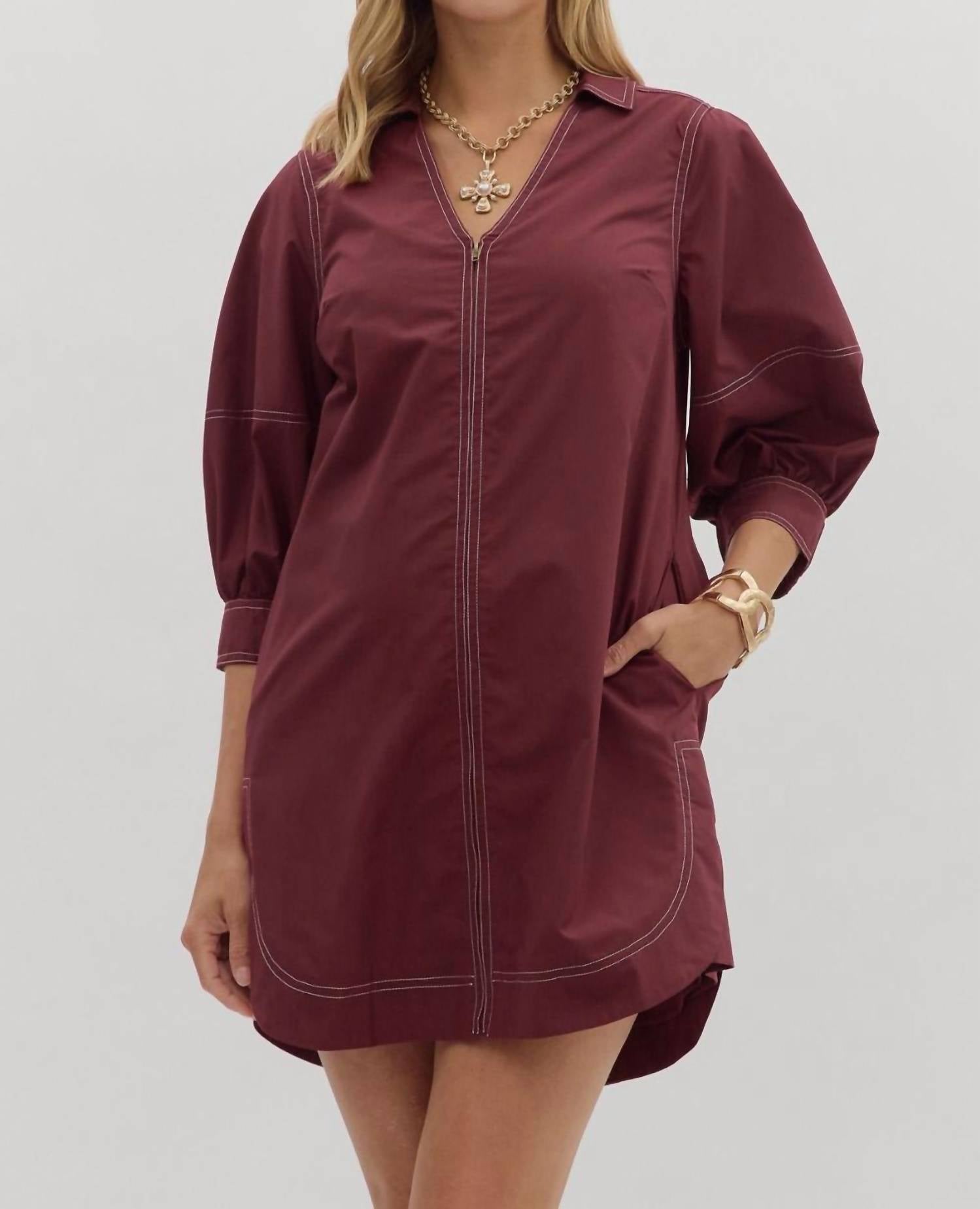 Elevate your summer wardrobe with the Maroon Zip Lantern Sleeve Mini Dress by Entro, designed for chic vacations or special occasions. This solid shift dress features three-quarter lantern sleeves and a flattering V-neck spread collar, complete with contrast accent stitch detail. Made from a lightweight cotton blend (80% polyester, 20% cotton), it ensures comfort and style, while the convenient zip closure adds ease to your dressing routine. With practical side pockets and a lined, non-sheer woven fabric, this dress is a must-have addition for a touch of quiet luxury. Model is 5'10" and is wearing a size small.