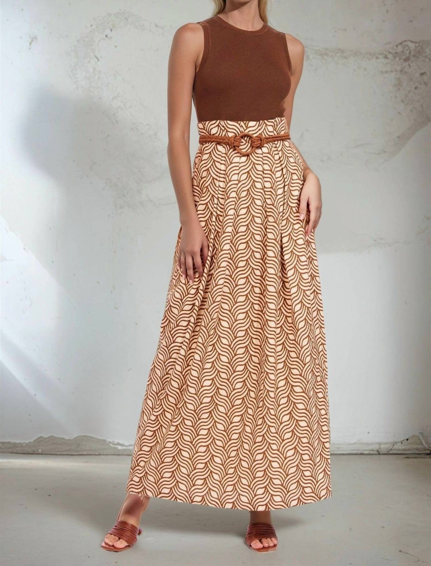 Elevate your wardrobe with the Noah Maxi Dress by EVA FRANCO, a stunning two-toned piece in a Montenegro hue. This sleeveless dress boasts a flattering A-line silhouette with a round neckline and a maxi pleated skirt, perfect for any spring occasion, including Thanksgiving. Made from quality cotton with a polyester lining, it features a stylish tie belt detail for a touch of Boho Chic elegance. Designed for versatility, this patterned maxi dress has a convenient pull-on closure, ideal for easy styling and layering.