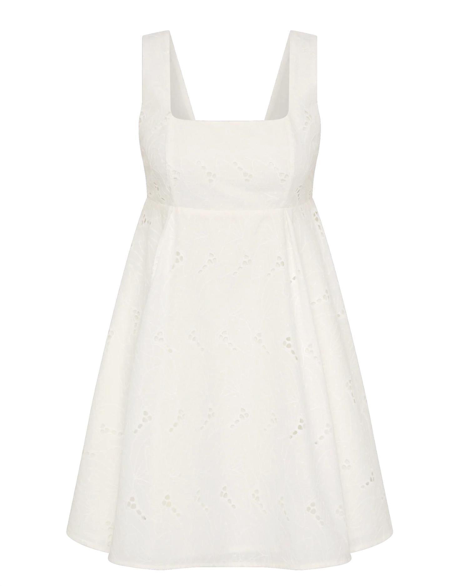 A short and breezy dress for those warmer days. Discover the feminine charm of the Lovis Mini Dress by Faithfull the Brand, tailor-made for your vacation wardrobe. This sleeveless mini dress is crafted from a cotton blend composed of 65% polyester and 35% cotton, featuring a square neckline and a shirred back waist panel for added comfort. Made in Birgitta Broderie Anglaise White, it showcases a delightful A-line silhouette with subtle pleats, and a convenient zip closure. For best results, we recommend dry cleaning this piece to maintain its minimalist elegance.