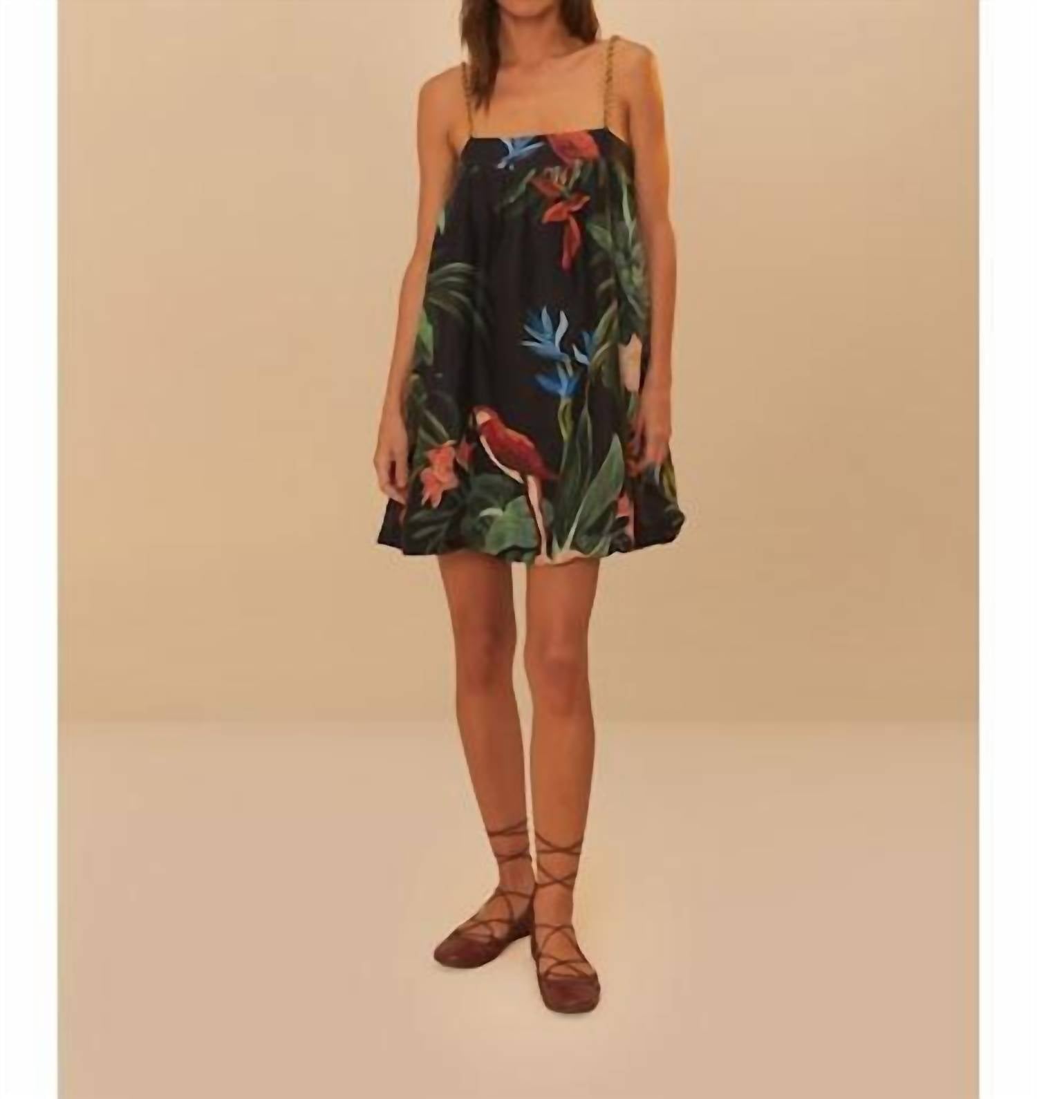 Elevate your summer wardrobe with the Midnight Macaw Fiesta Sleeveless Mini Dress by FARM RIO, showcasing a striking floral print in black. This boho chic A-line dress features spaghetti straps with beaded accents that enhance its playful balloon shape. Made from a luxurious blend of 55% Linen and 45% Viscose, it offers a pull-on design for effortless styling. Perfect for a beach day, maintain its beauty with machine wash care.