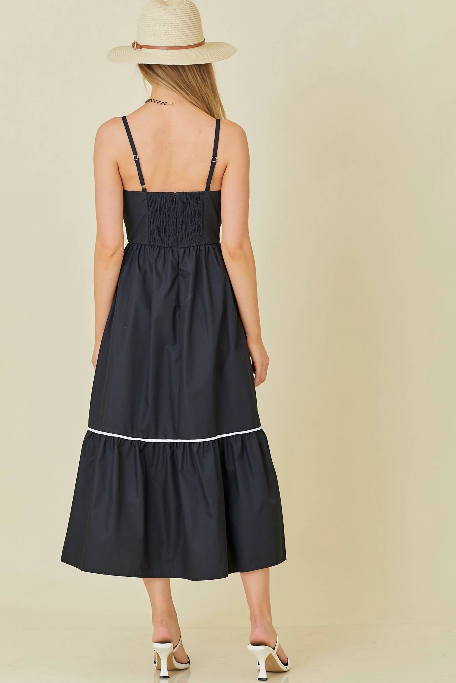Just add slides or mules and you are good to go. Experience timeless elegance with the Contrast Piping Dress by Fashion Go, a sophisticated black midi designed to impress. Featuring delicate spaghetti straps and a chic squareneck, this A-line silhouette is crafted from a blend of 80% polyester and 20% cotton. The standout contrast piping enhances its classic appeal, while the practical zip closure ensures a perfect fit. Enjoy effortless style and comfort with this luxurious piece.