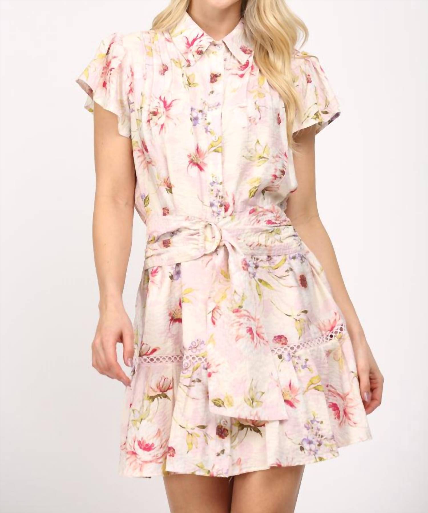Introducing the Floral Belted Mini Dress by Fate, a chic and feminine piece perfect for your summer wardrobe. This shirt-silhouette dress features cap sleeves and a collared neckline in a delightful pink multi-floral pattern. Composed of a lightweight, breathable fabric blend with the upper part being 83% rayon and 17% nylon, and the lower part 100% rayon, it ensures comfort without compromising style. Closure type: Button closure. Care: For best results, hand wash or machine wash on a gentle cycle and lay flat to dry. Ideal for vacation and day outings, it combines a relaxed fit with elegant lace accents.