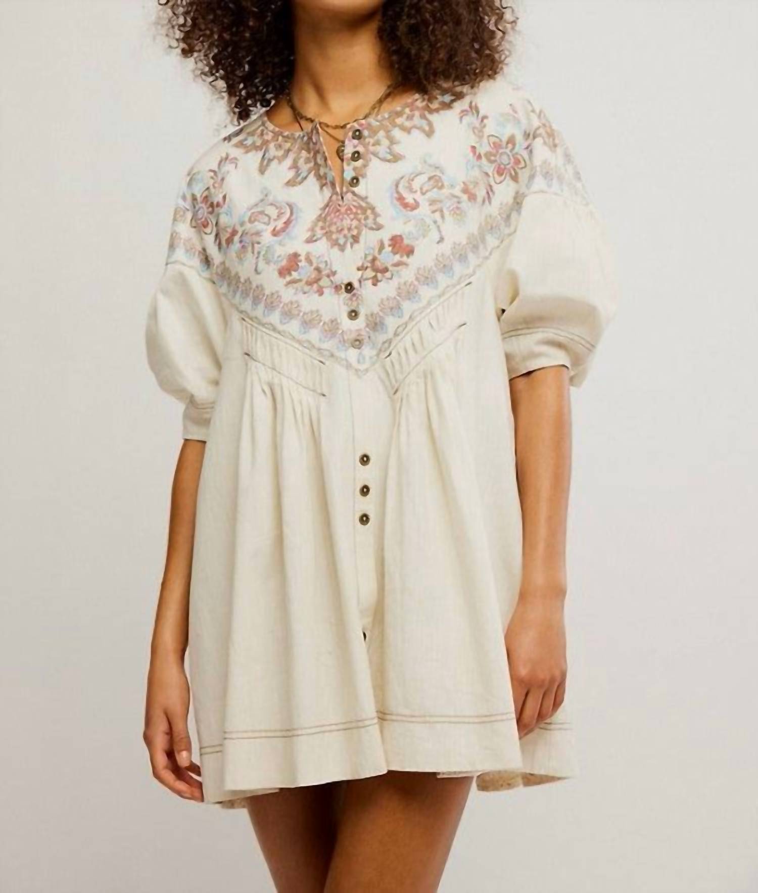 Elevate your vacation wardrobe with the Orson Mini Dress by Free People, a stylish choice perfect for sunny getaways. Featuring elbow sleeves and crafted from 100% Cotton, this ivory combo mini dress boasts a scoop neckline and defined pleating at the front with contrast stitching throughout. Its shirt silhouette is completed with a button closure, adding to its boho chic appeal. Care for this piece by machine washing it cold.
