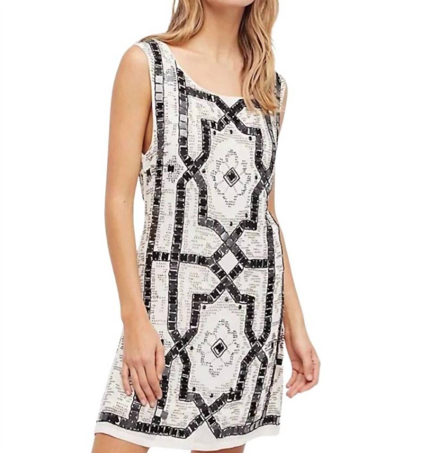 Estampa geométrica intrincada de lantejoulas por toda a peça, criando um visual marcante e elegante. Apresenta um design sem mangas, decote redondo e costas abertas dramáticas para um toque ainda mais elegante.