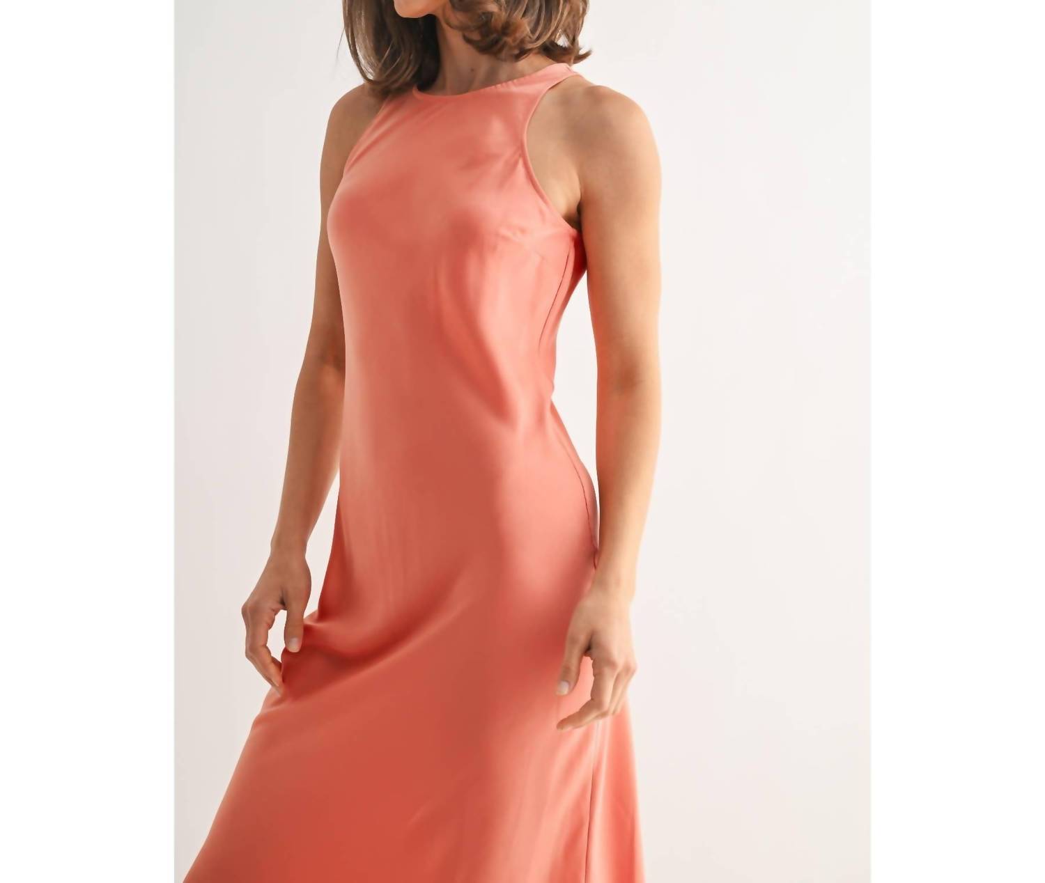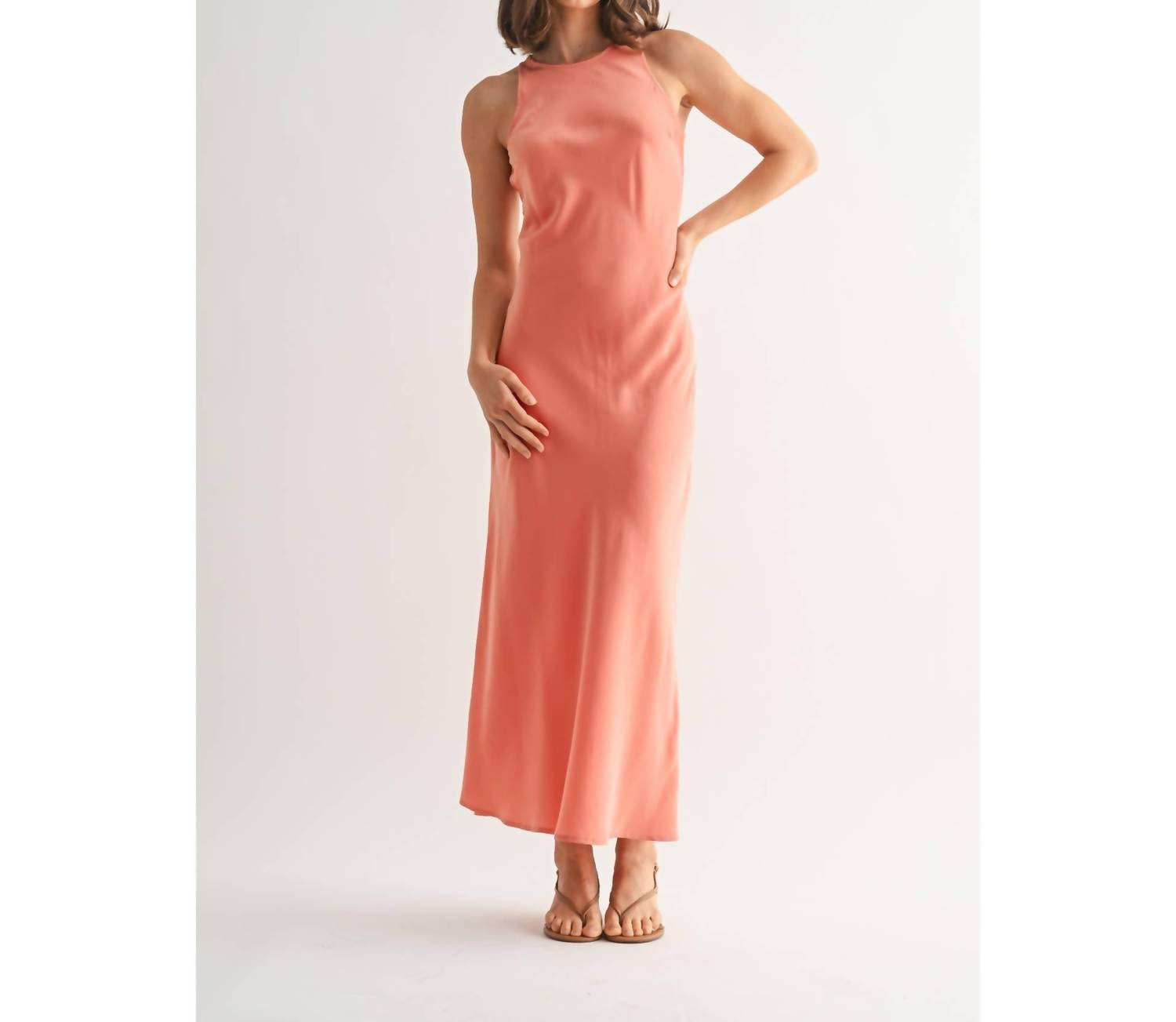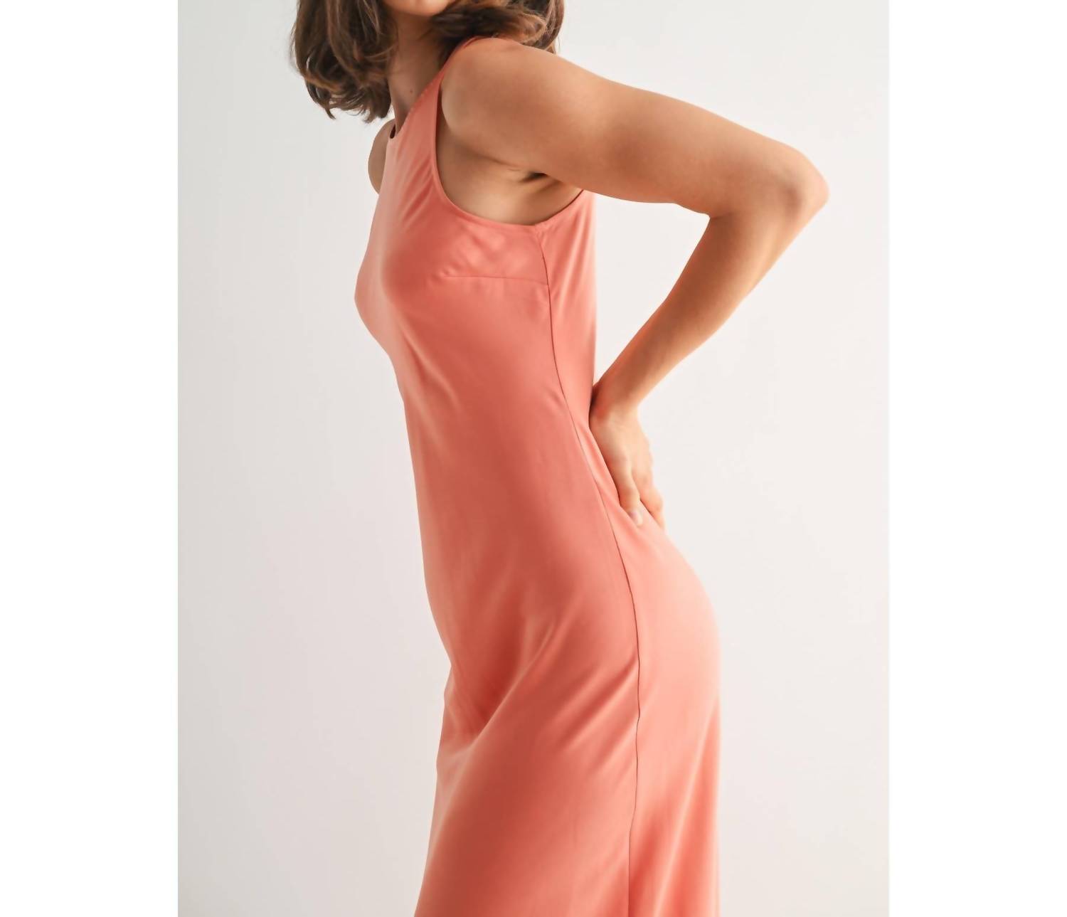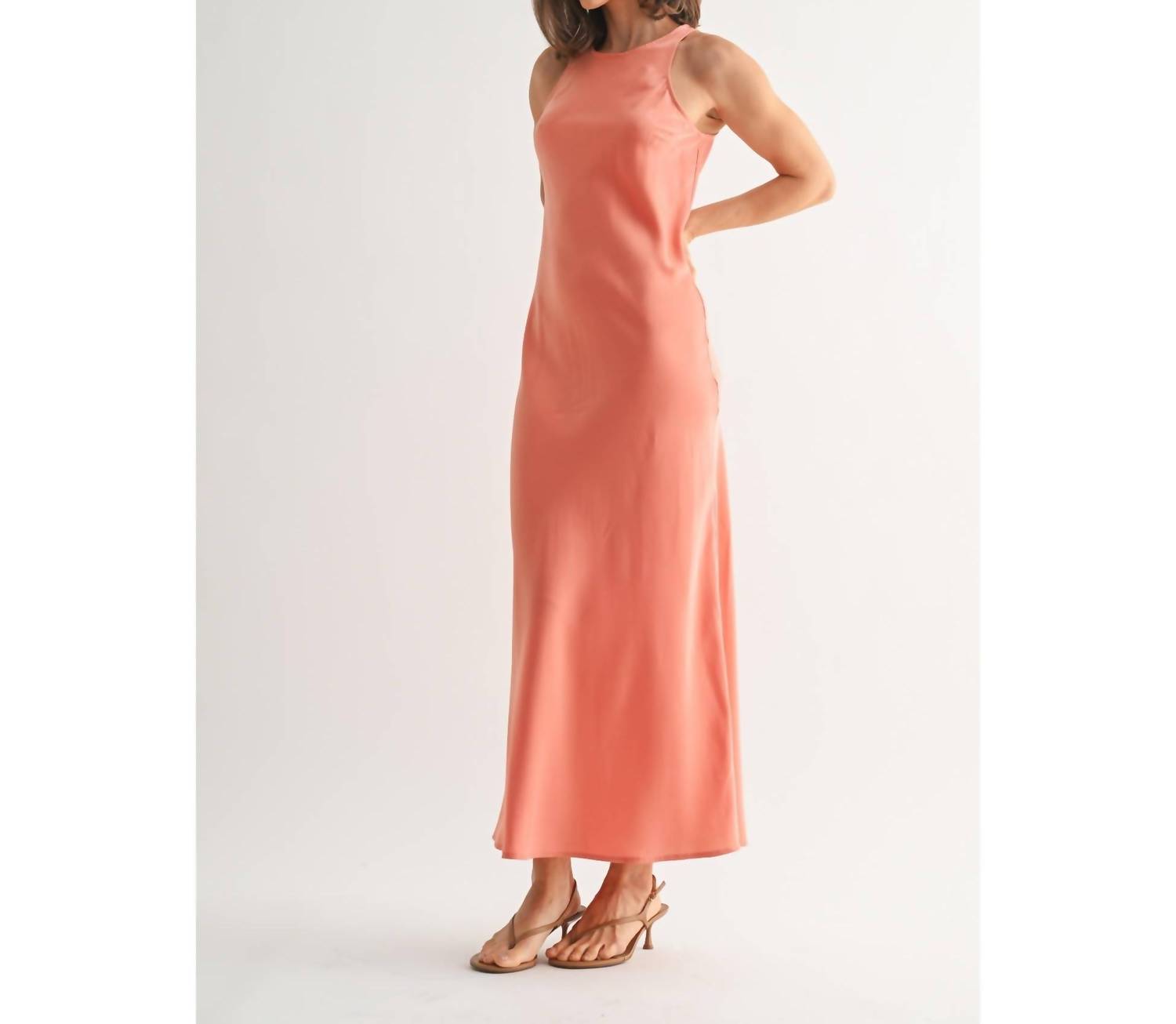 Introducing the Coral Satin Maxi Dress by Fun2Fun, a sophisticated sheath silhouette designed for the modern woman. This sleeveless dress, with its elegant crewneck, is crafted from luxurious satin, making it the perfect choice for a spring dinner party or Easter celebration. It features a secure zip closure for easy wear. For care, simply hand wash to maintain its minimalist charm and timeless style.