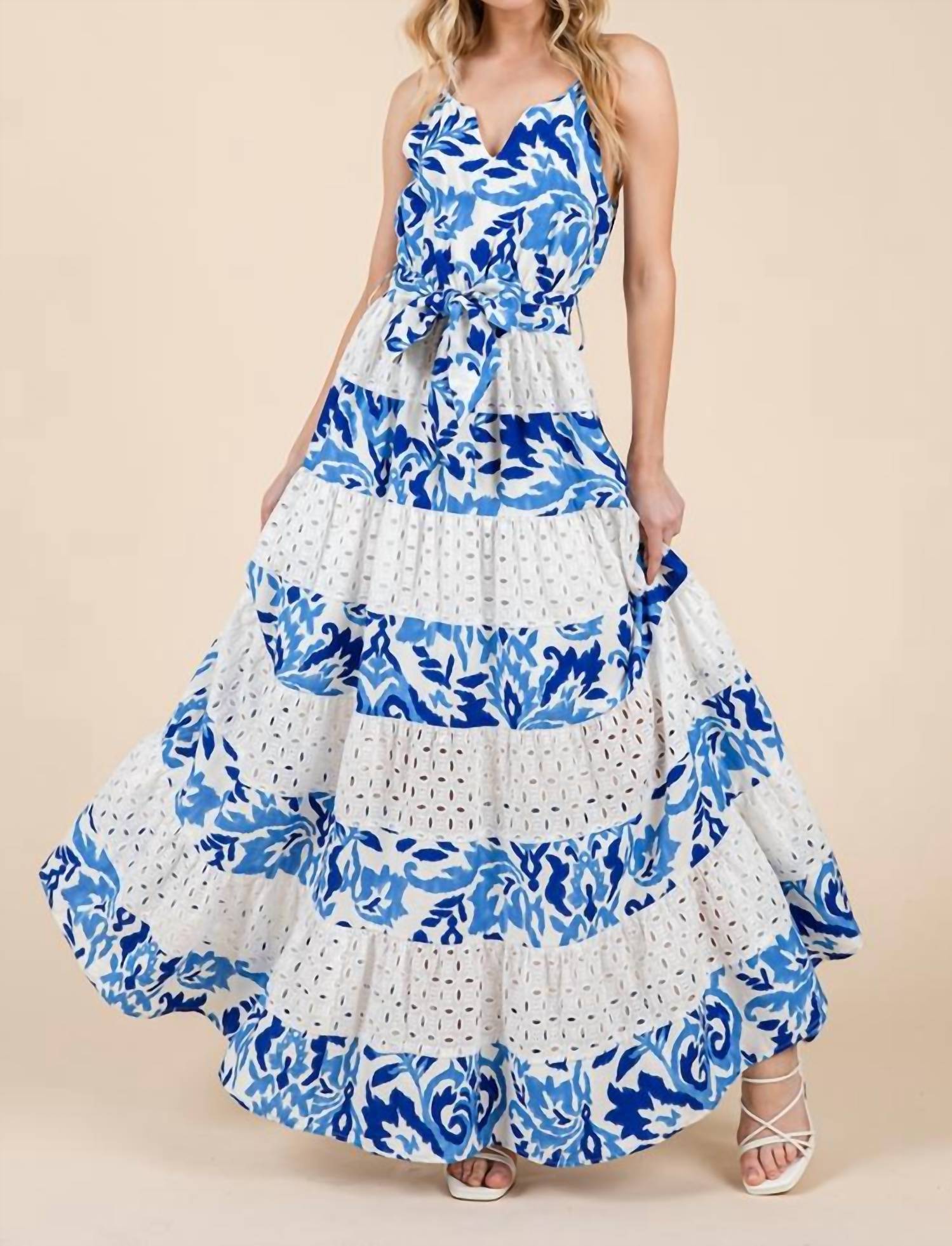 Introducing the Floral Eyelet Lace Tiered Maxi Sundress by GeeGee X Lovelo, a must-have for your summer vacation wardrobe. This boho chic piece features spaghetti straps and a V-neckline, designed for a flattering fit and flare silhouette. The dress comes in a vibrant blue multi-pattern, perfect for adding a touch of playfulness to your look. Country of Origin: China.