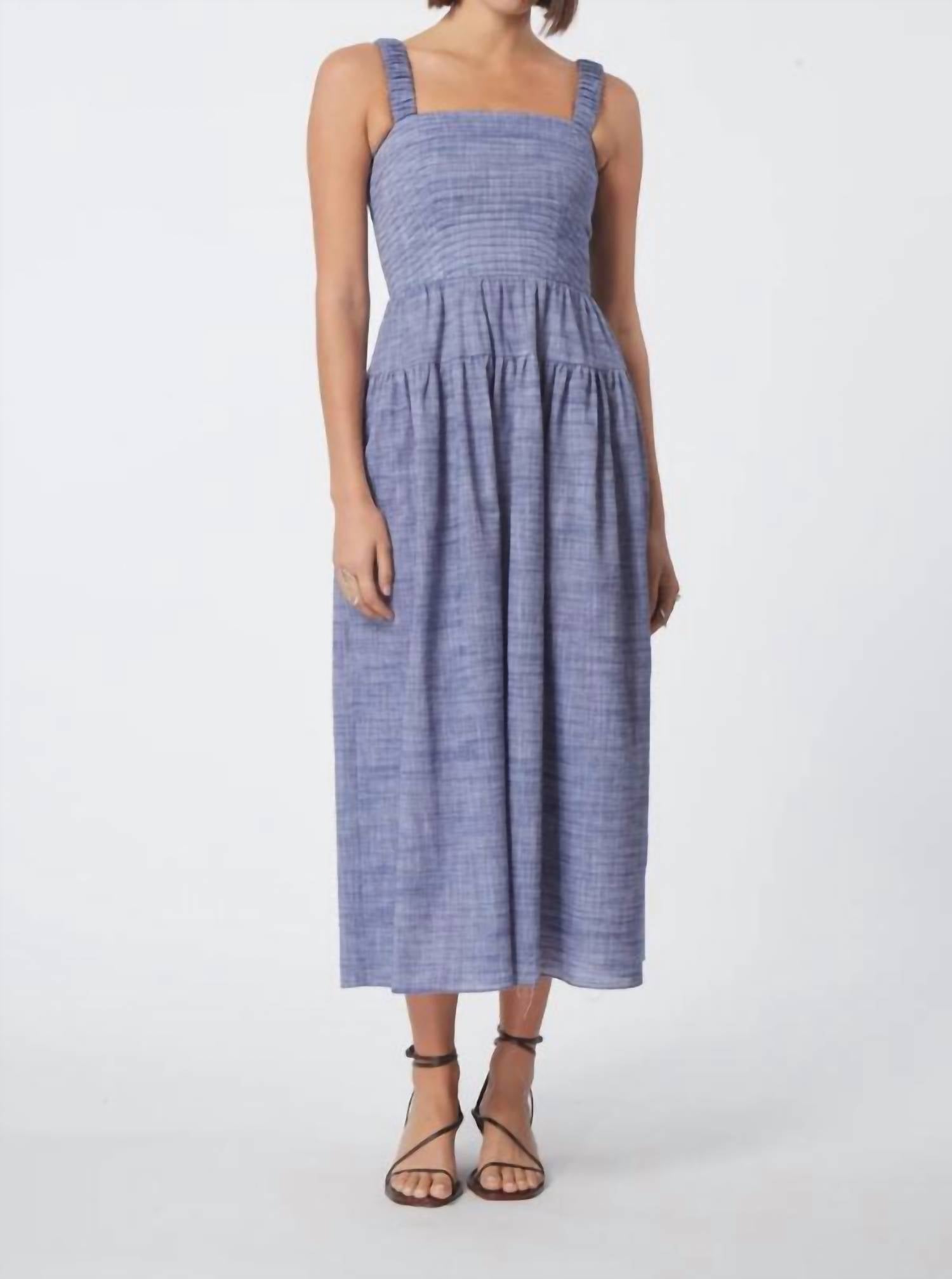 This Midi Dress, crafted from 100% cotton chambray, features a square neckline, stitched quilted bust detail, and flowy A-line skirt with a smocked back for a comfortable fit. Complete with pockets and a zip closure, it offers effortless style and versatility.