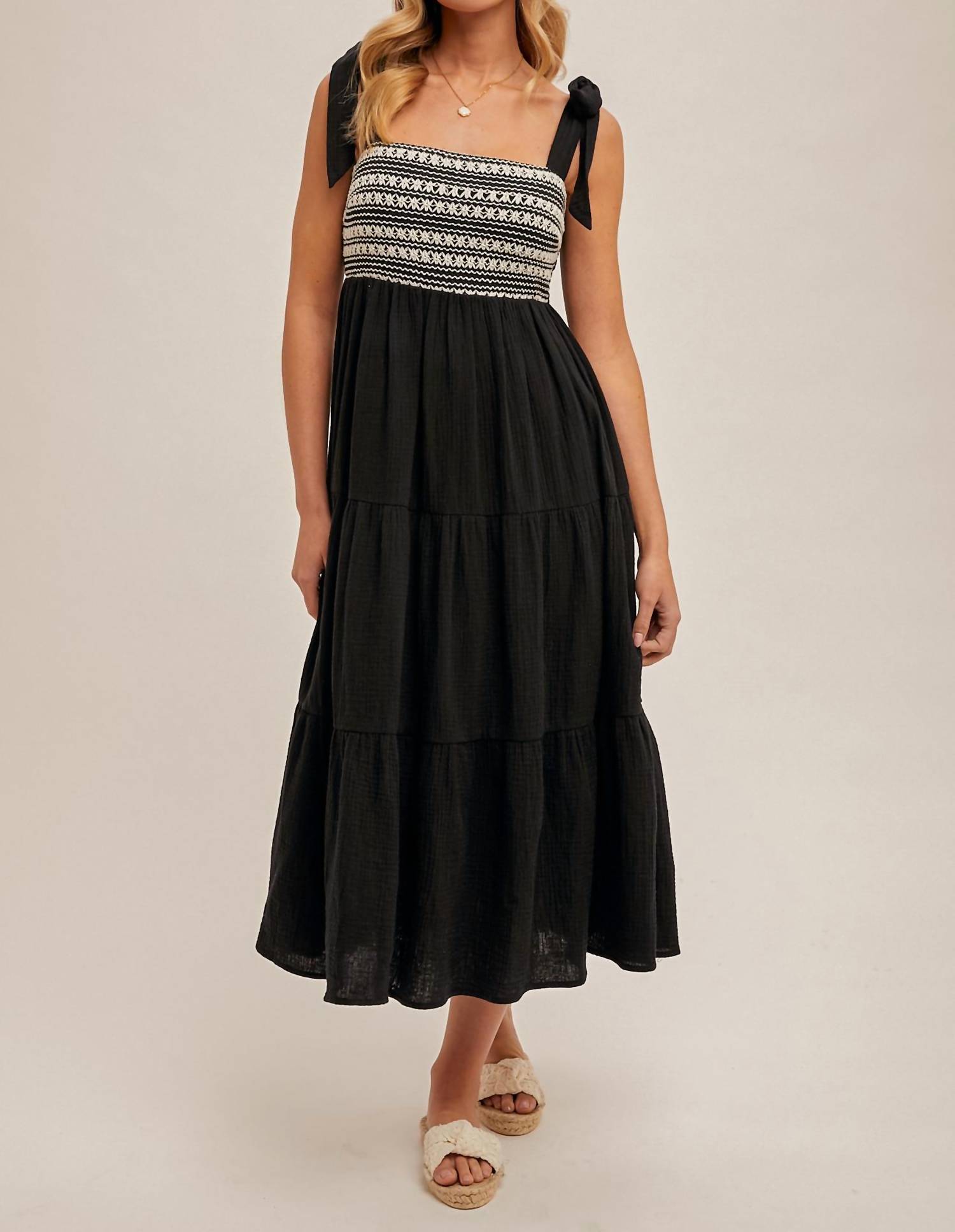 The perfect length dress does exist. Indulge in the minimalist charm of the Crochet Front Shoulder Tie Dress by Hem & Thread, a perfect addition to your vacation wardrobe. This black midi dress features delicate spaghetti straps and an elegant empire waist silhouette, complete with a squareneck design. Crafted from contrasting fabrics: 100% cotton self, 75% polyester and 25% cotton contrast, with a 100% cotton lining. The dress secures with tie closures and is best cared for by hand washing and line drying.