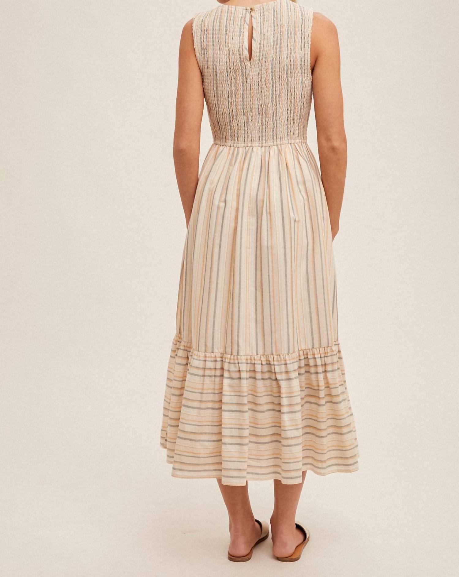 Just add slides or mules and you are good to go. Elevate your summer style with the Striped Sleeveless Smocked Dress by Hem & Thread, an elegant taupe piece perfect for vacation. This A-line midi dress features a sleeveless design and a charming crewneck, all adorned with mixed stripes for a maximalist appeal. Made from 100% Cotton with a Rayon lining, it closes with buttons for a secure fit. Care instructions include hand washing and line drying, ensuring your dress remains vibrant and fresh.