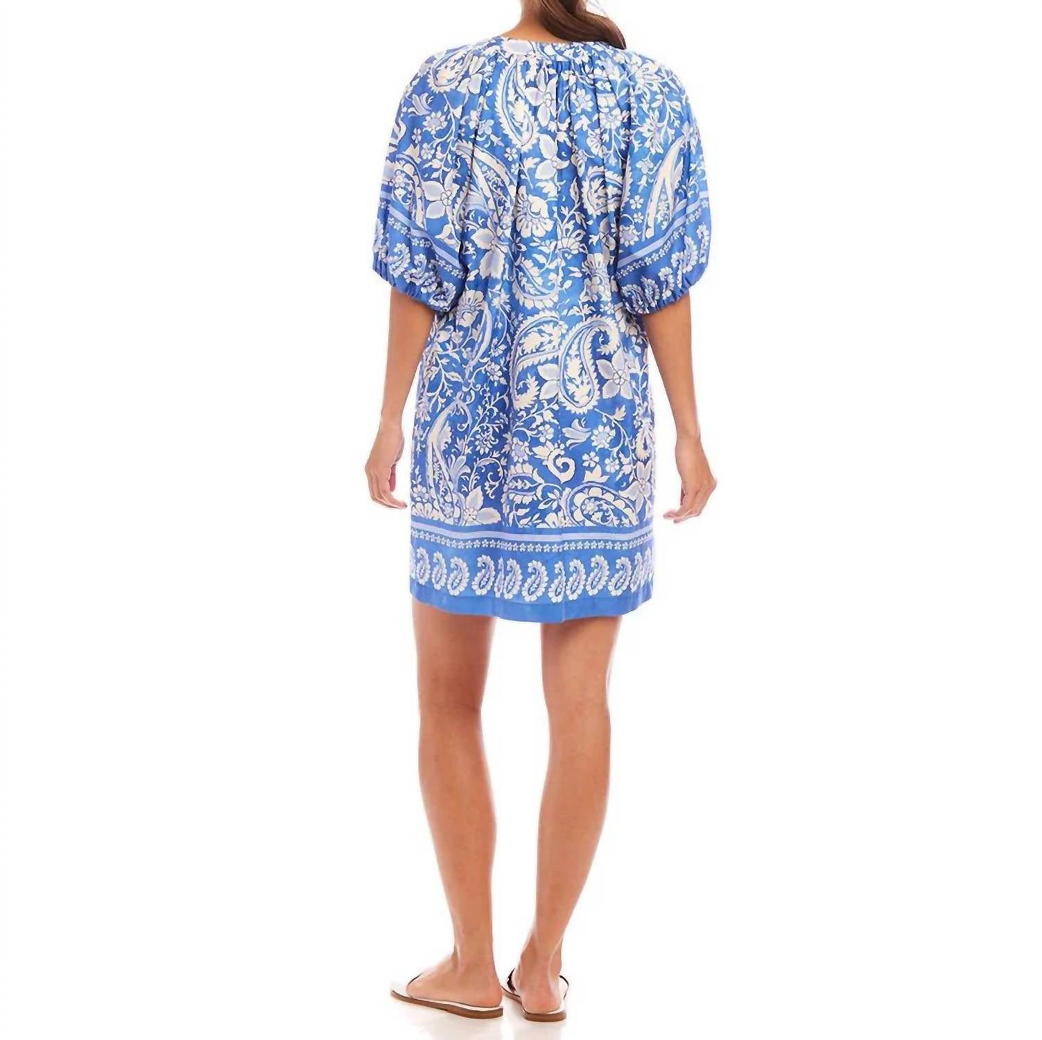 The kind of easy and flattering dress you'll be reaching for all season long. Introducing the Puff Sleeve Peasant Dress by Karen Kane, a beautiful Boho Chic piece in Blue Paisley Print for your summer escapes. This dress features three-quarter puff sleeves with elasticized cuffs and a comfortable pull-on closure. Crafted from 100% cotton, it offers a lined and relaxed fit with a garment length of 33.5 inches. Care for this vacation-ready dress by hand washing separately and laying it flat to dry or opting for a dry clean.