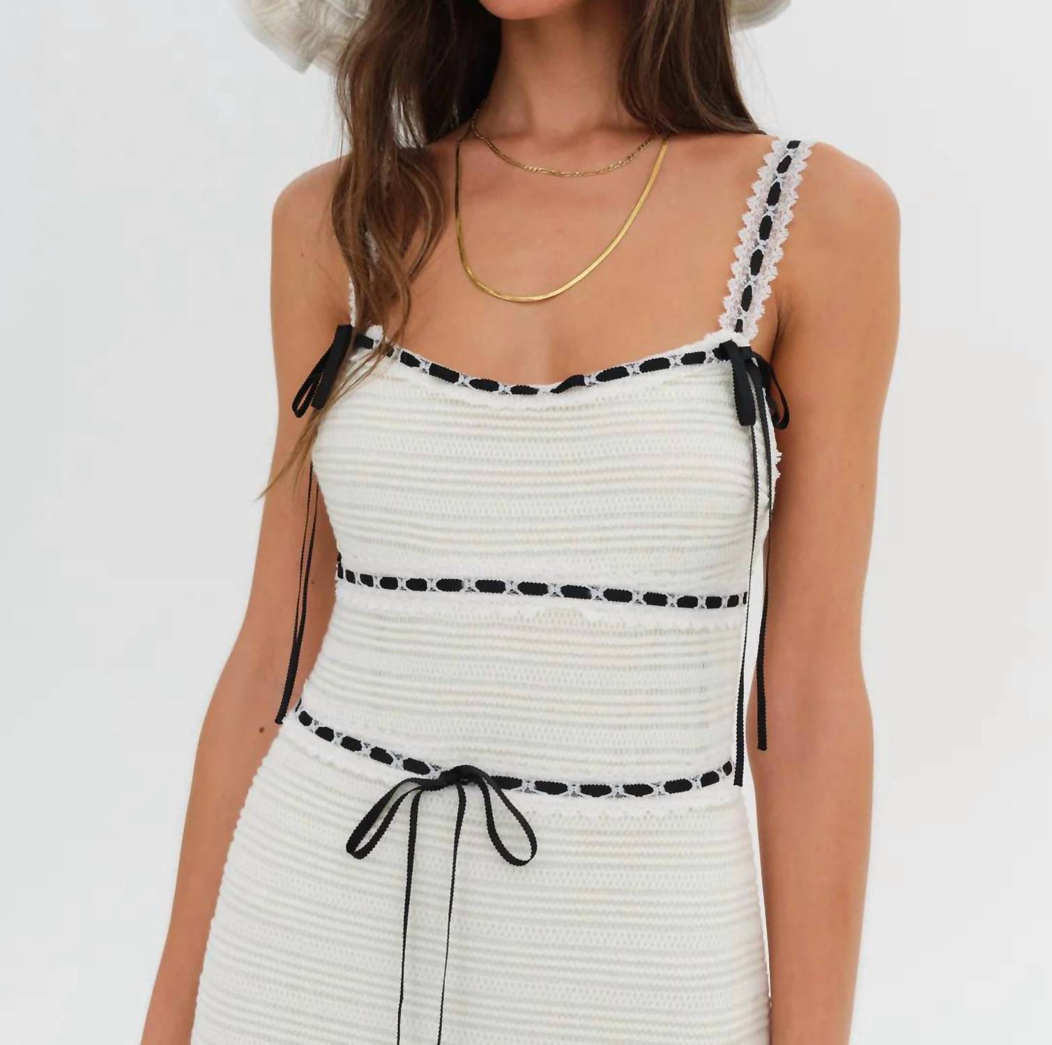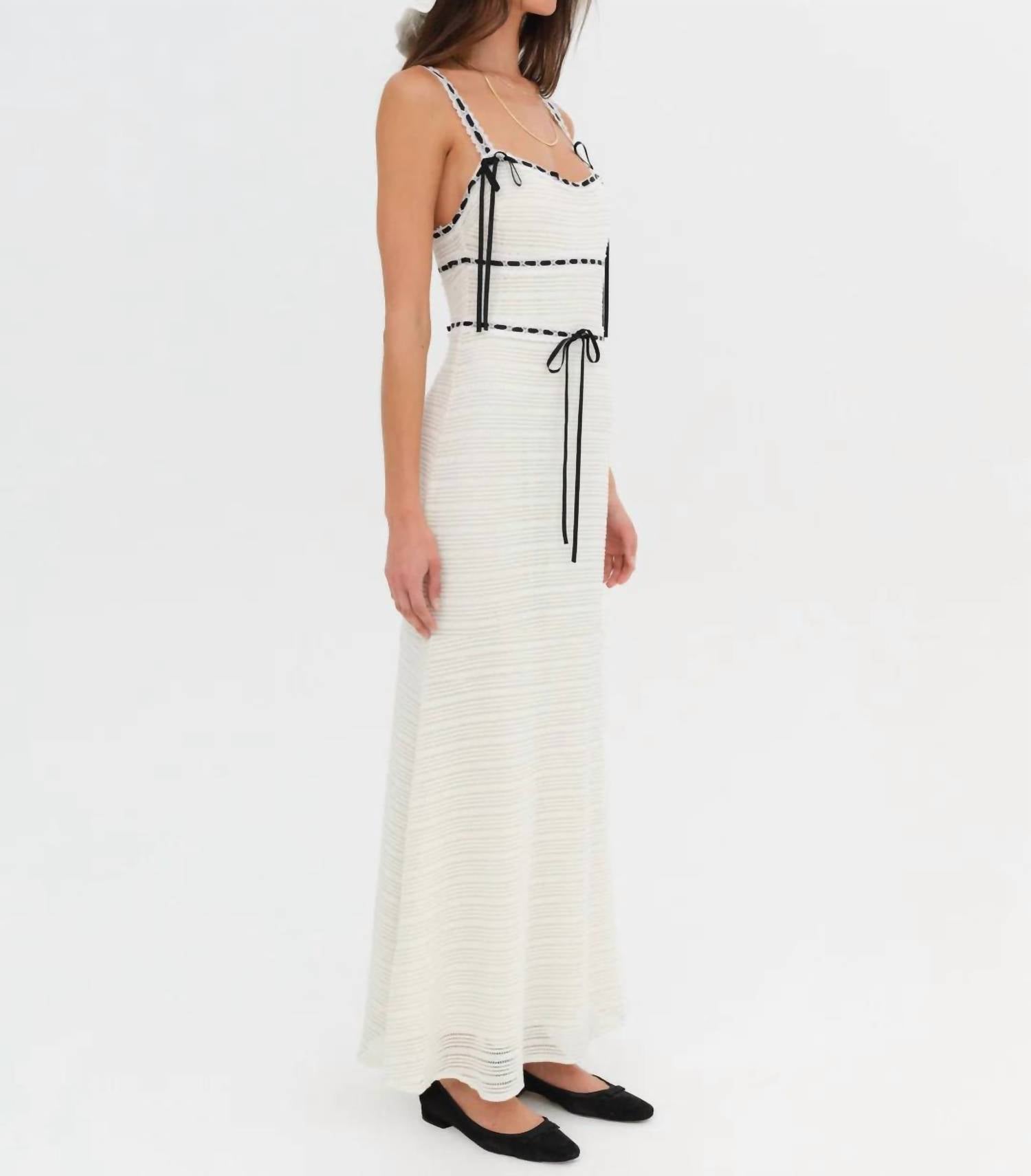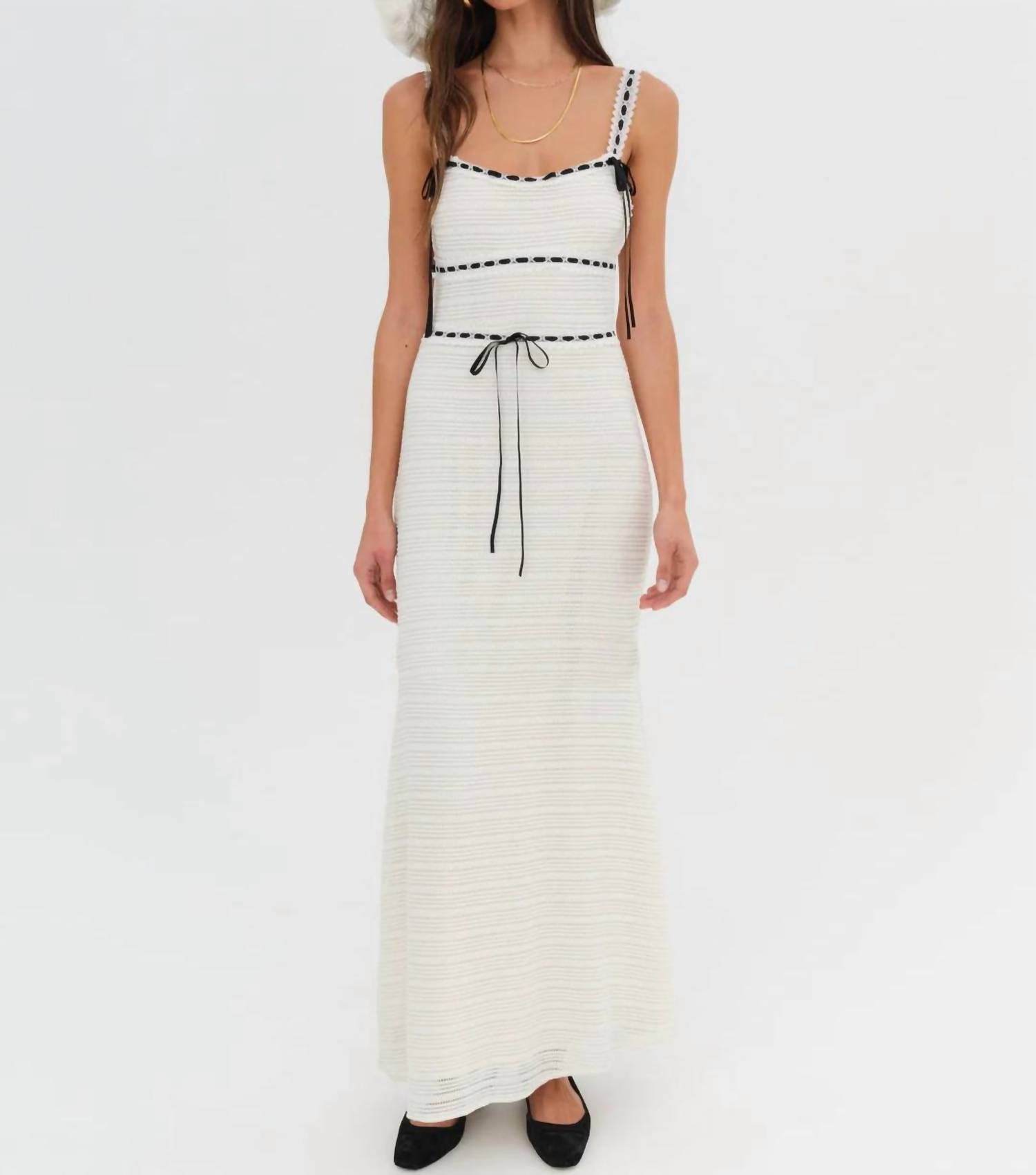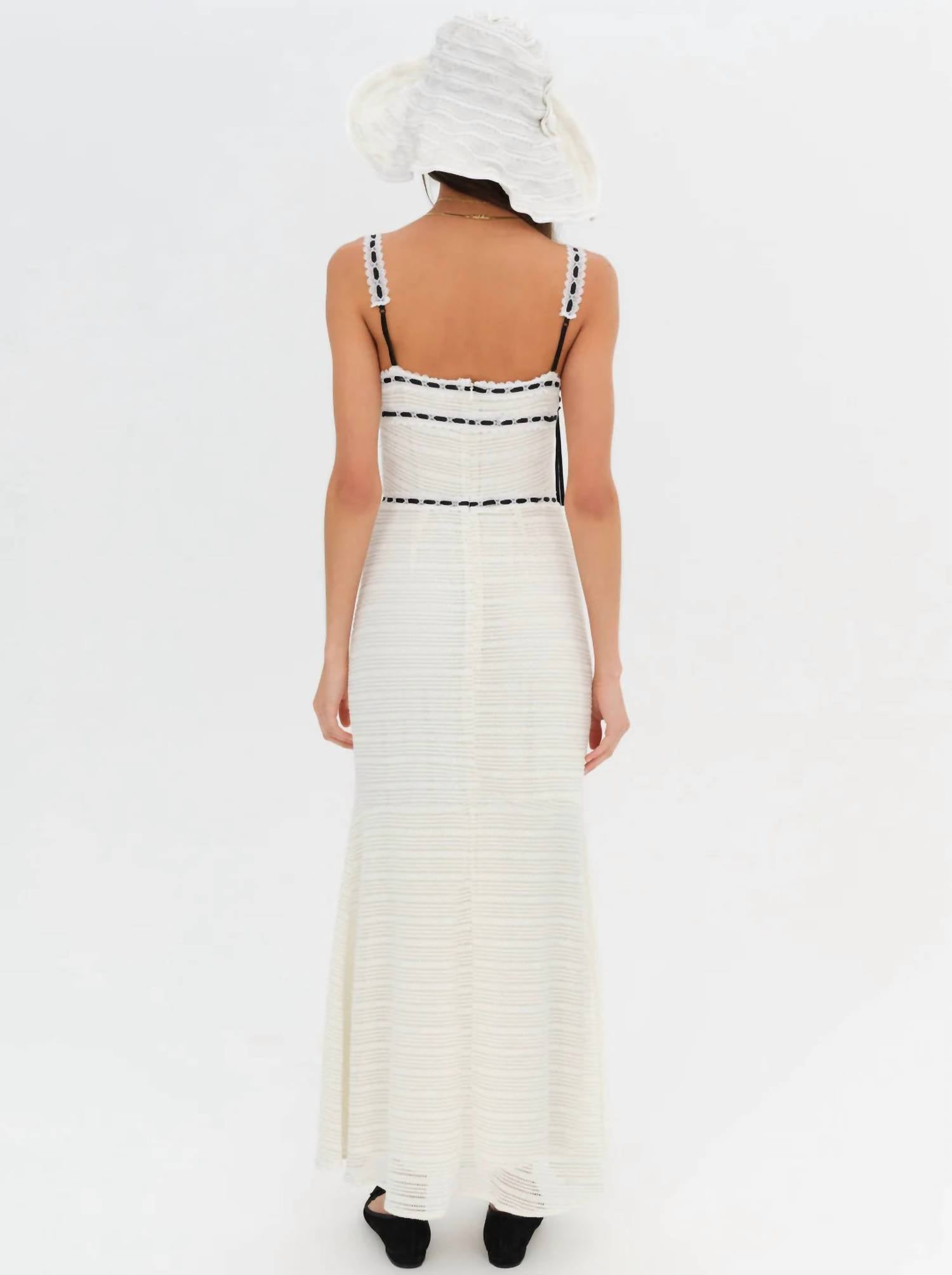 Who doesn't love a good maxi dress? This one you'll be reaching for season after season. Introducing the Mayfair Crochet Maxi Dress by Lil Lemons By For Love and Lemons, an essential piece for effortless style. This sleeveless dress in white, crafted from a cotton blend, showcases a textured pattern with charming contrast grosgrain ribbon trims. Its A-line silhouette and sweetheart neckline make it ideal for both vacations and spring occasions. Closure: Side zipper. Care: Dry clean.