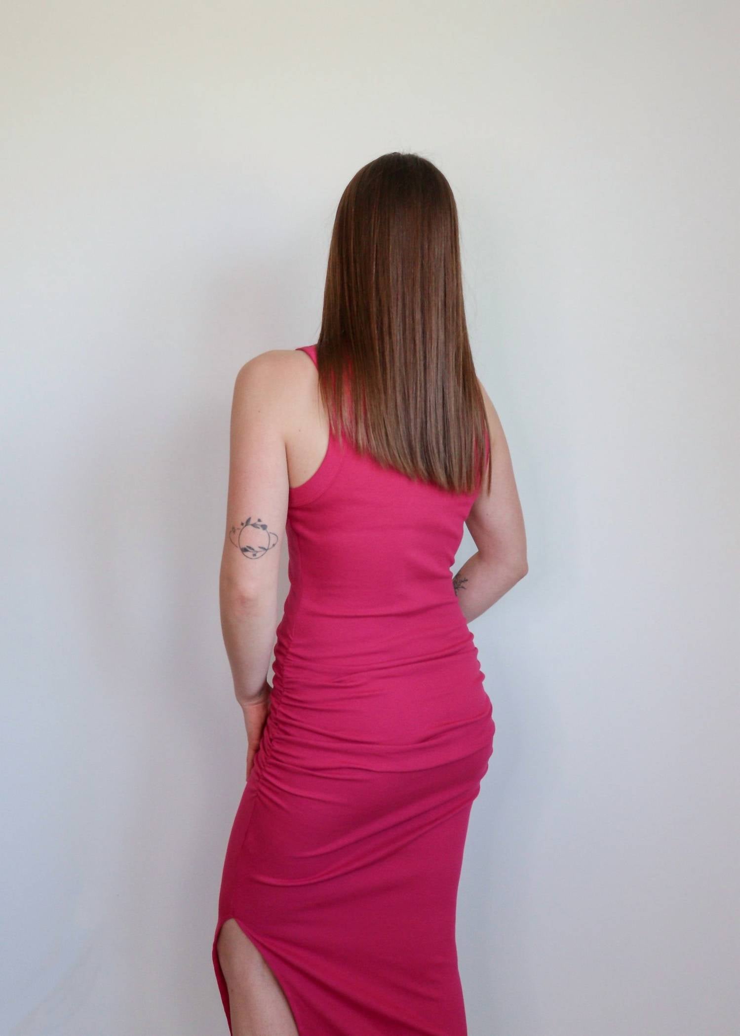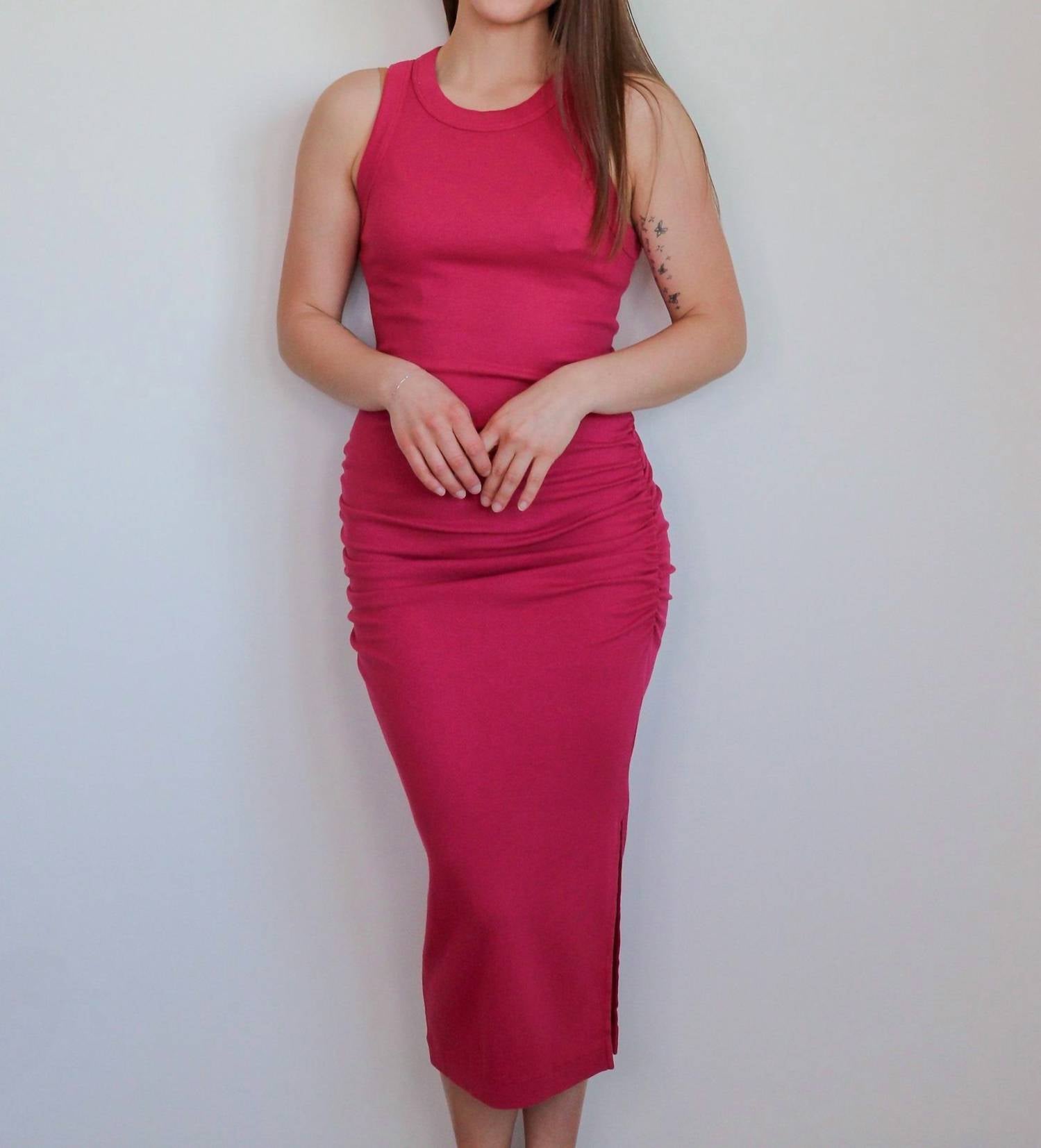 Meet the Wren Ribbed Midi Dress by Michael Stars, a perfect blend of casual elegance in sangria. With a sleeveless design and crafted from a 48% Cotton, 48% Modal, 4% Spandex fabric, this sheath silhouette dress features side ruching and a slit, adding a touch of charm. This pull-on style dress measures 44 inches in length, making it ideal for transitional weather and perfect for holiday parties. Designed with convenience in mind, it is machine washable for effortless care. Model is 5'4" and wearing an extra small.
