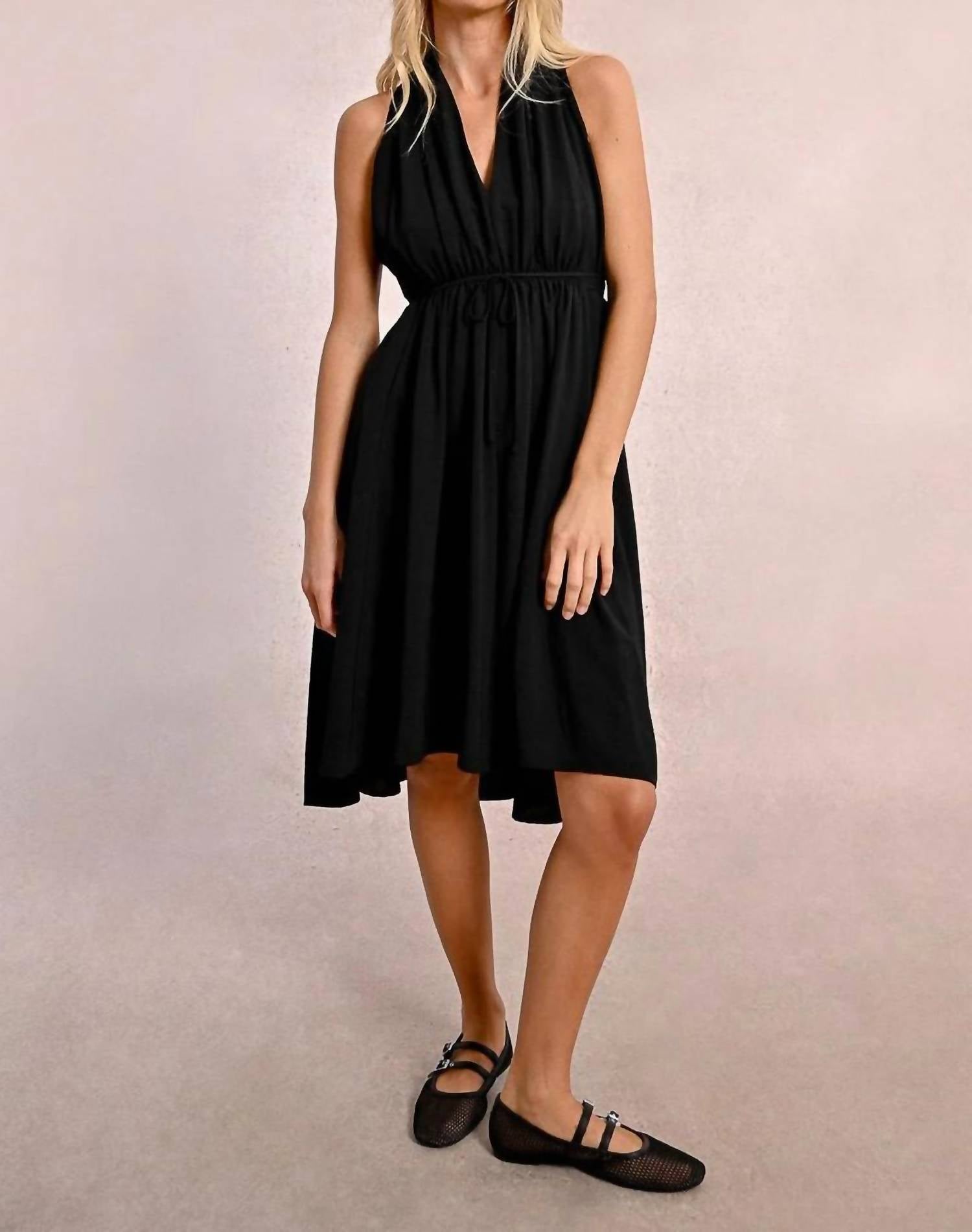 Just add slides or mules and you are good to go. The Short Pleated Dress by MOLLY BRACKEN is a chic summer staple in a classic black shade. This sleeveless A-line dress features a plunging V-neckline and a flattering marked and elasticated waist. It's crafted from 95% polyester and 5% elastane, with a matching lining, providing both comfort and style. The dress measures 100cm from the shoulder for a size S and has a discreet zip closure at the back. Dry clean only.