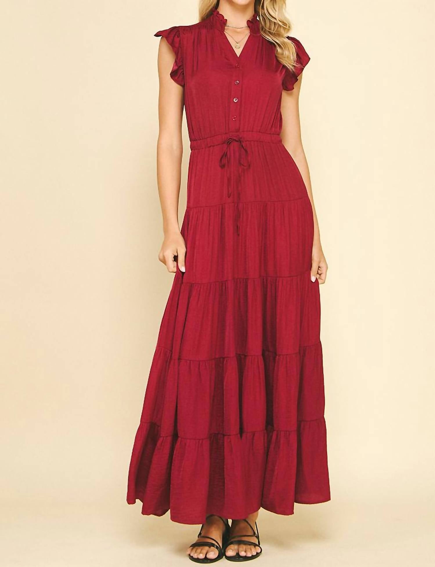 A maxi dress that is just as cute as it is comfortable. Elevate your style with the Penelope Maxi Dress by PINCH, perfect for any dinner party or special occasion. This burgundy dress features a cap sleeve design and a gracefully tiered skirt that flows into a maxi length. Made from 100% polyester, it cinches elegantly at the waist with a tie and offers a button closure for added detail. With bust measurements ranging from 40" to 44" and lengths from 55" to 57", this piece is best hand washed to maintain its rich color.