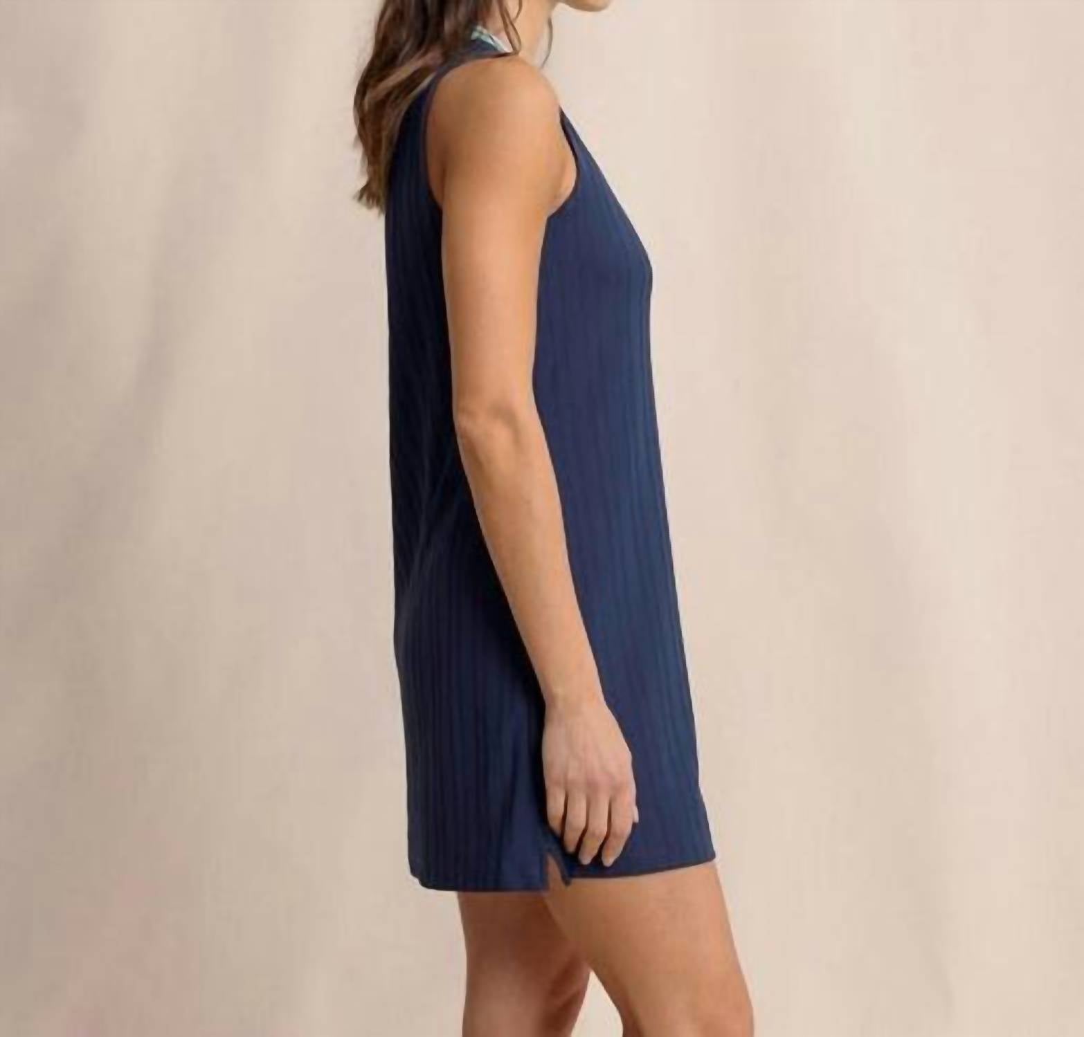 Pair with your favorite sandals for an effortlessly chic look. Made for movement, this active dress is crafted with wicking fabric and added stretch. The subtle stripe texture and contrast V-neckline add interest and flatter your figure. This style makes the perfect tennis dress, adding style and sophistication to your court-side look. Wicking. UV Protection Models are 5'8.5-5'9" wearing a size extra small. Machine Wash.