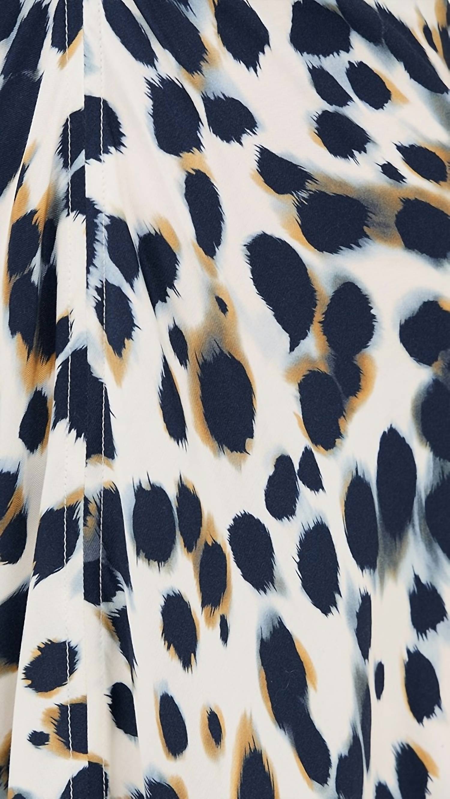 Just add slides or mules and you are good to go. Discover the Rem Dress by A.L.C., a chic choice in Blue Multi with an eye-catching animal pattern. This women's midi-length dress in a luxurious, lightweight silky twill offers a flattering silhouette with ruching at the waist. Crafted from 100% viscose, it features short sleeves and a crewneck, finished with a hidden zip closure at the back. Imported, it requires a dry clean for care. Garment length: 46.5 inches.