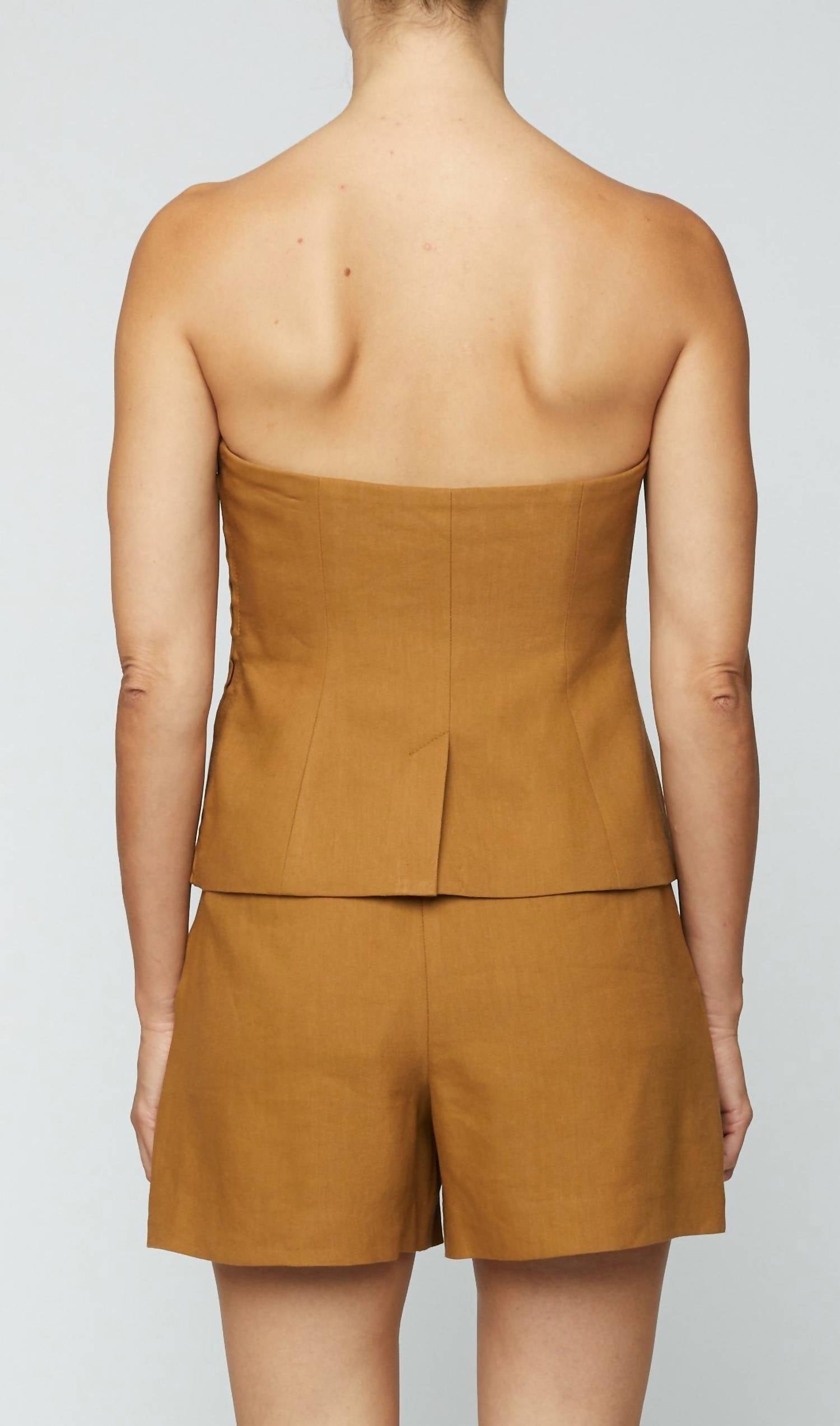The Renee Sleeveless Top by A.L.C. offers a sophisticated style in a striking copper tone, perfect for any fall occasion. This strapless off-the-shoulder blouse features a luxuriously boned bodice with nonstick silicone trim for added comfort. Crafted from a midweight linen blend, it includes a practical side zip closure and faux slip pockets. It is beautifully lined with two blends, providing both structure and flexibility, and is proudly made in Vietnam. Care: Dry clean only.